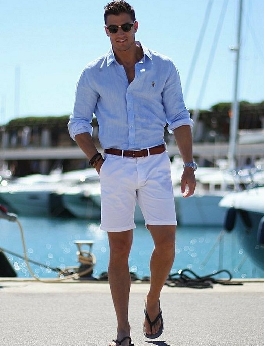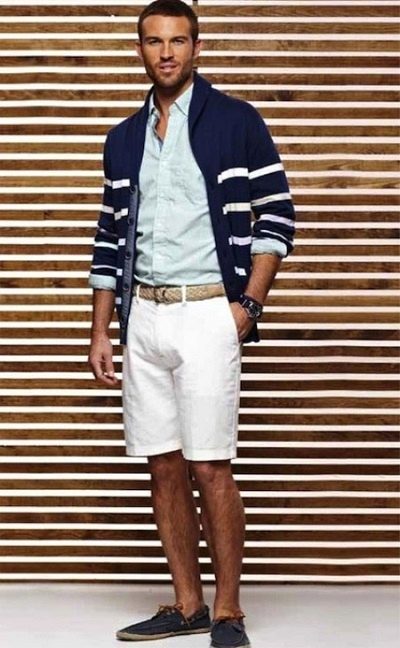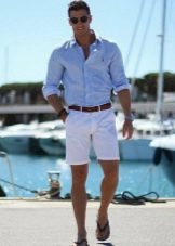 - To the beach fully armed. Snow white shorts, sky-colored shirt, blue striped sweater and light canvas sneakers look great with a woven beige belt. Such a small accent emphasizes the airiness of the image.