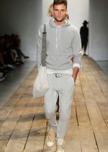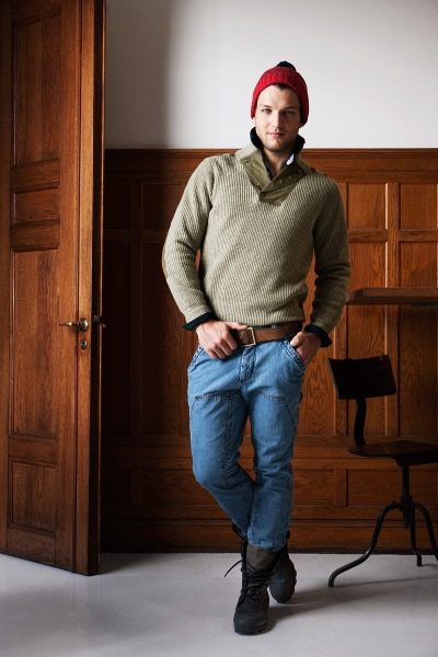 - Casual style. A comfortable and fashionable outfit will adorn any guy who is going for a walk or meeting with friends in nature. A sweater and jeans of a loose fit, comfortable boots and a contrasting belt with a mustard tint give the image a slight pleasant casualness.