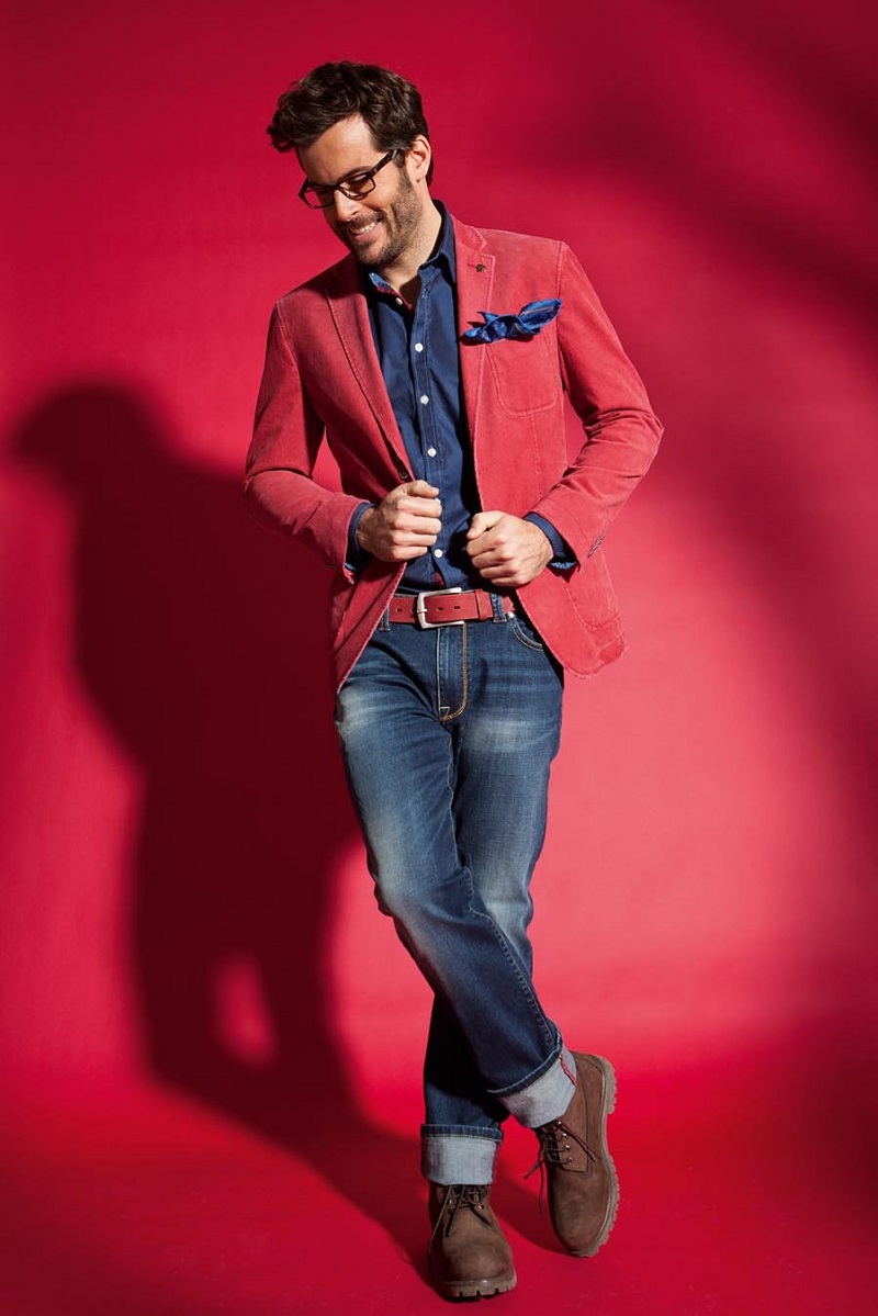 - For those who are not afraid of color. Blue jeans, brown boots, a scarlet jacket and a belt to match him - a bold, but at the same time solemn outfit. Your best friend's wedding or first date is an excuse to dress so that everyone around you looks exclusively at you.