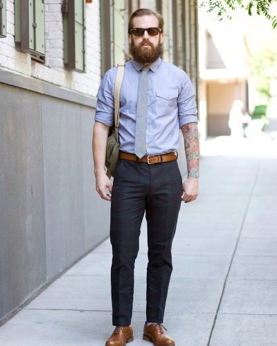 - Classic + a note of brutality. A restrained blue and gray outfit with cropped plaid trousers and a shirt with a tie, diluted with light brown boots and a matching belt.