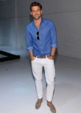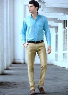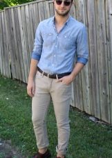 in addition to blue pants, a shirt of this color will make an excellent duet with a beige bottom, gray, burgundy shades;
