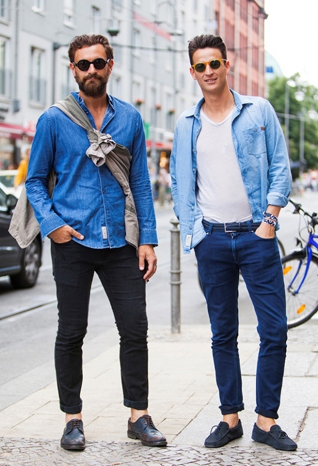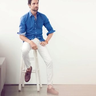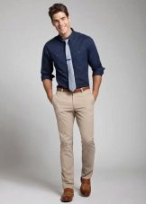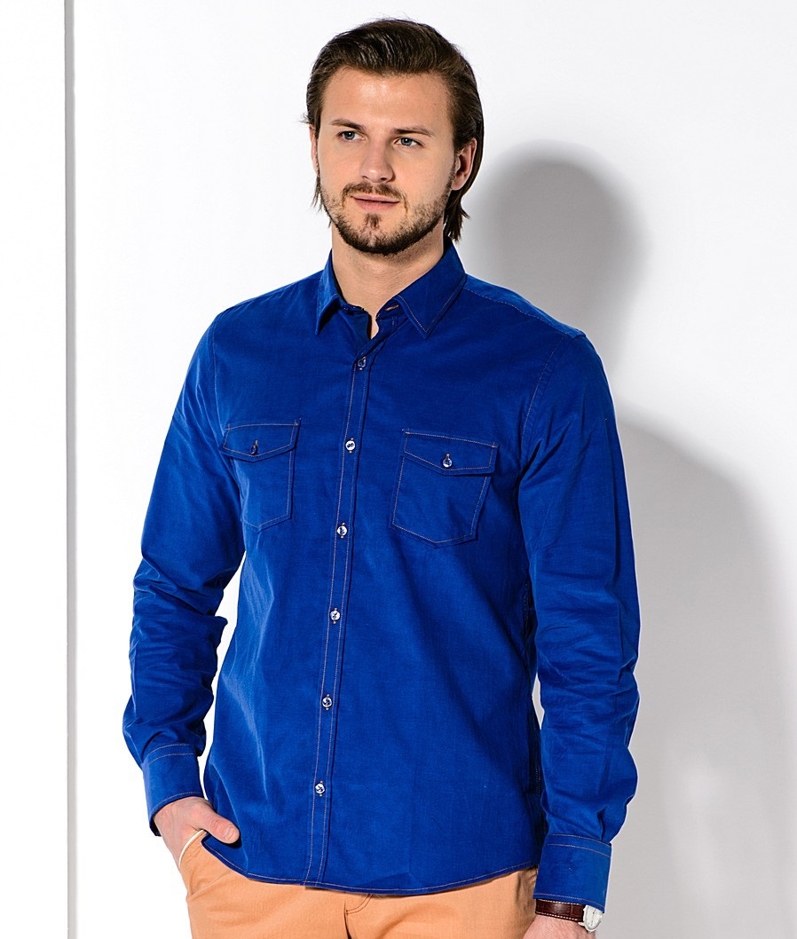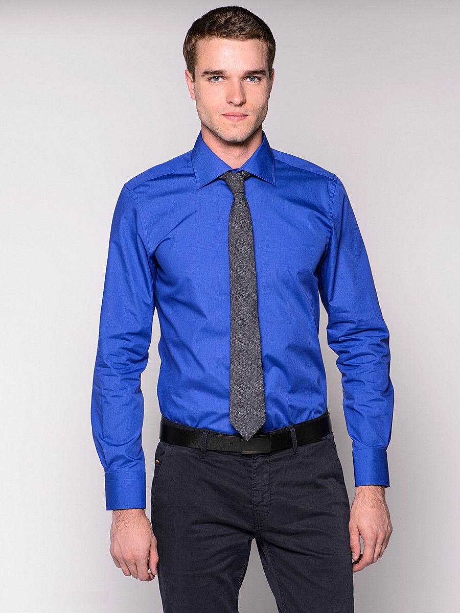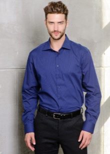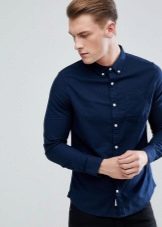 - Casual. Casual shirts are designed for everyday wear. They look less strict when compared to classic models, but more restrained compared to sports ones. Blue shirts made in this style are recommended to be combined with jeans, slacks, straight or tapered trousers, vests or jackets with short sleeves. Shoes in such ensembles should be comfortable and practical (moccasins, loafers, monks).
