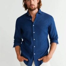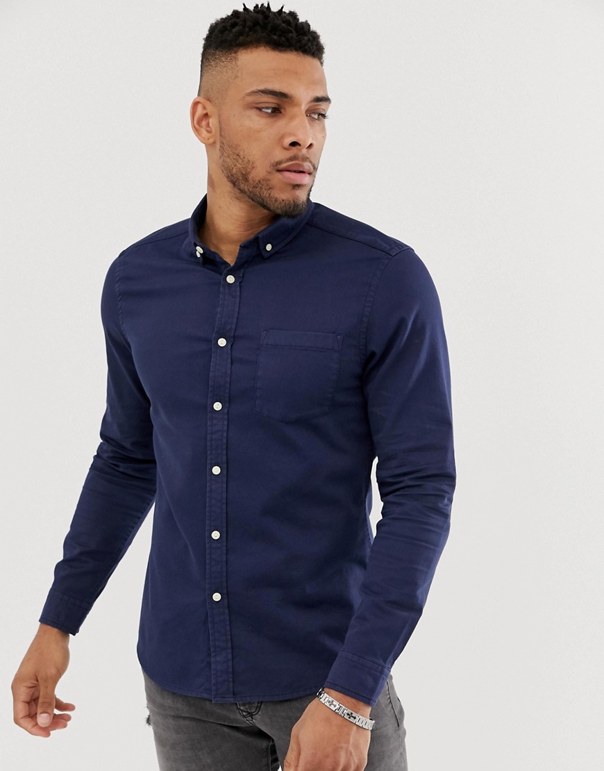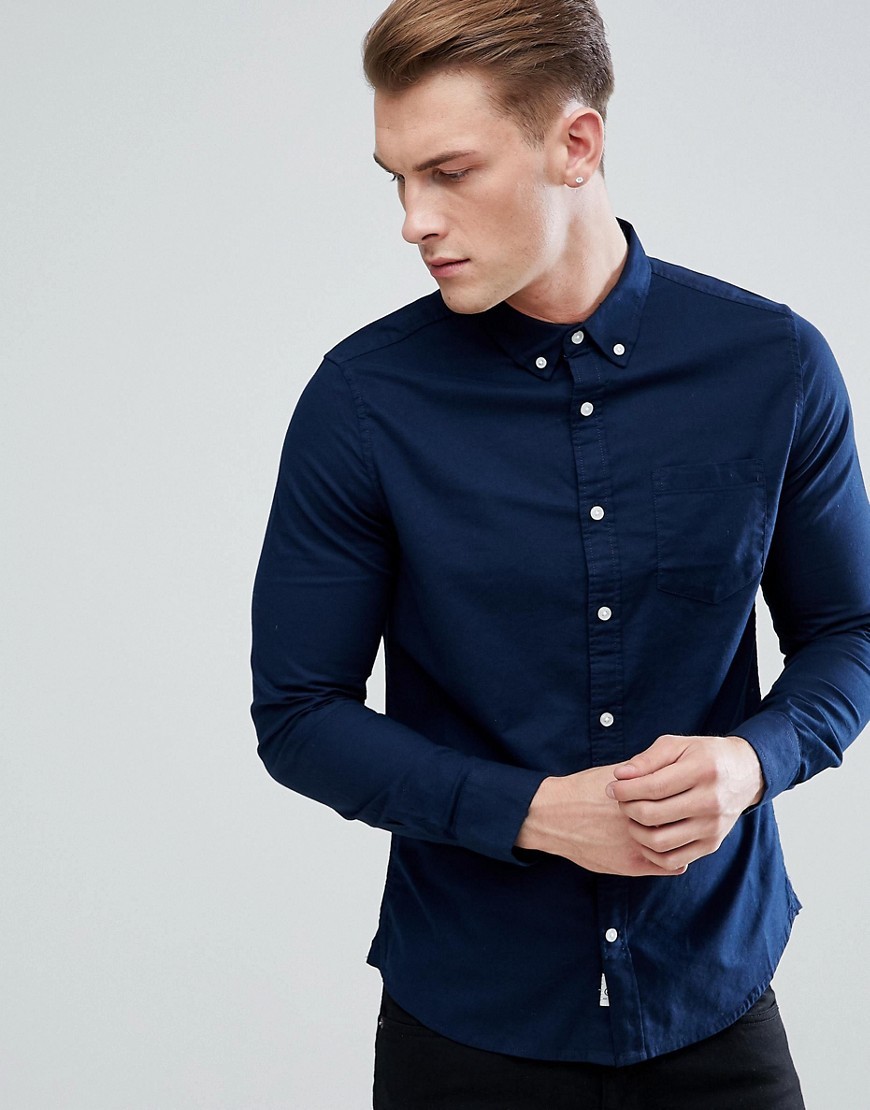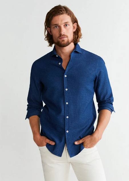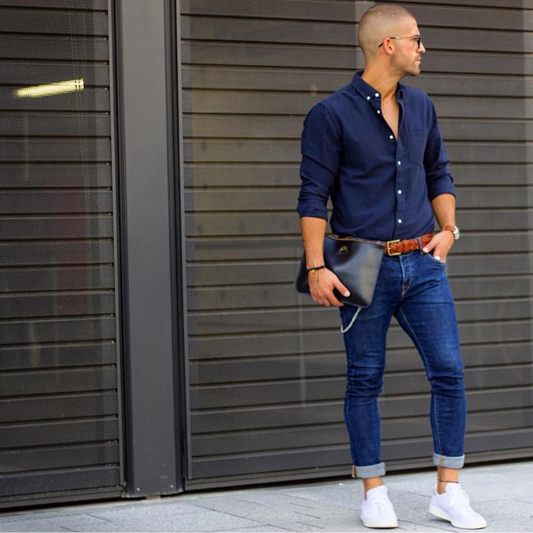 - Casual. Casual shirts are designed for everyday wear. They look less strict when compared to classic models, but more restrained compared to sports ones. Blue shirts made in this style are recommended to be combined with jeans, slacks, straight or tapered trousers, vests or jackets with short sleeves. Shoes in such ensembles should be comfortable and practical (moccasins, loafers, monks).