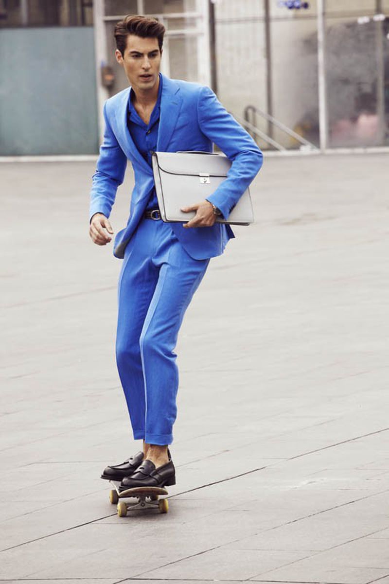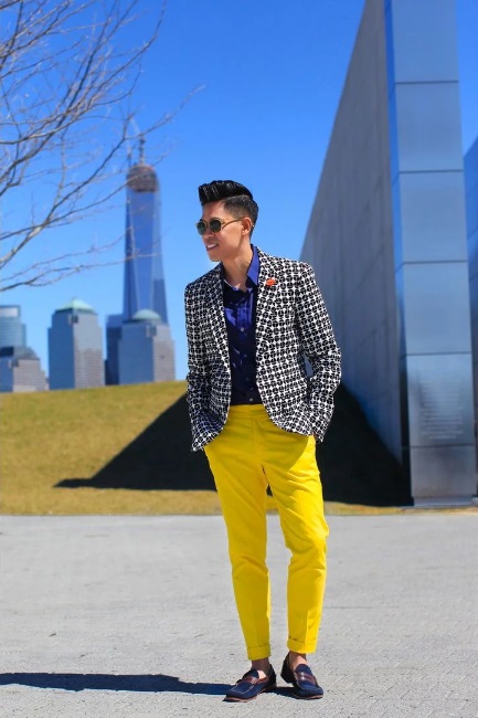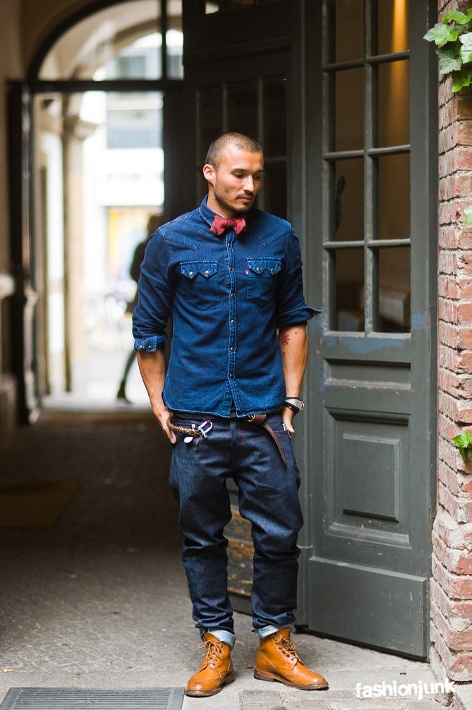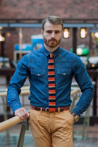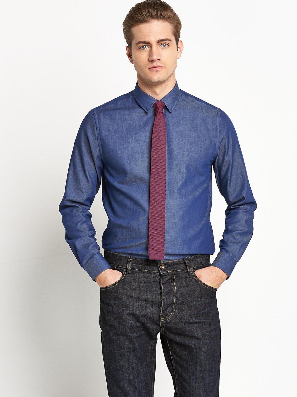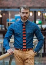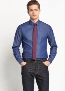 An example of this is a bold casual ensemble consisting of an indigo shirt, dark gray jeans and a narrow wine-pink tie.