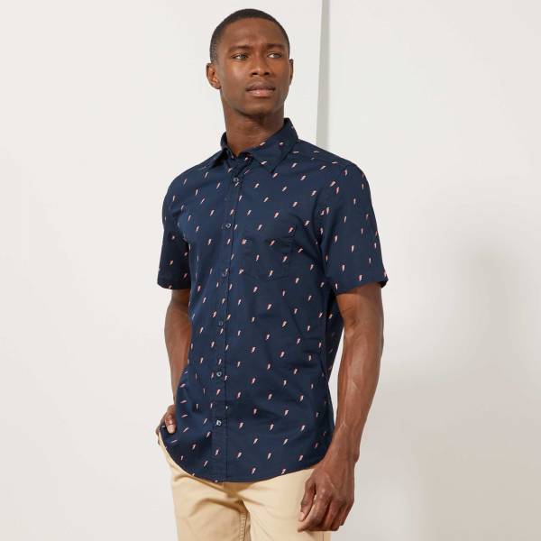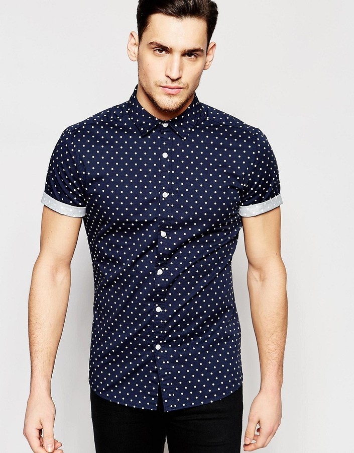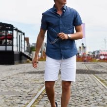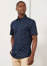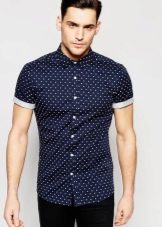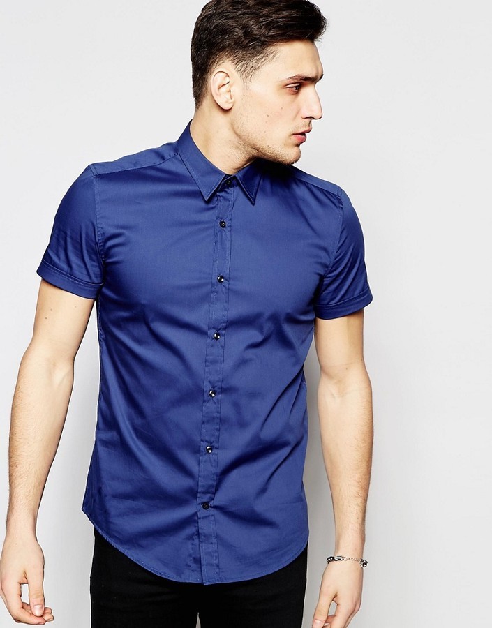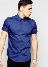 Short sleeved models are usually used for casual or sporty looks. Most often, they are worn outside, combined with jeans or joggers. Elongated blue shirts with short sleeves are allowed to be worn outside with slacks, straight jeans.