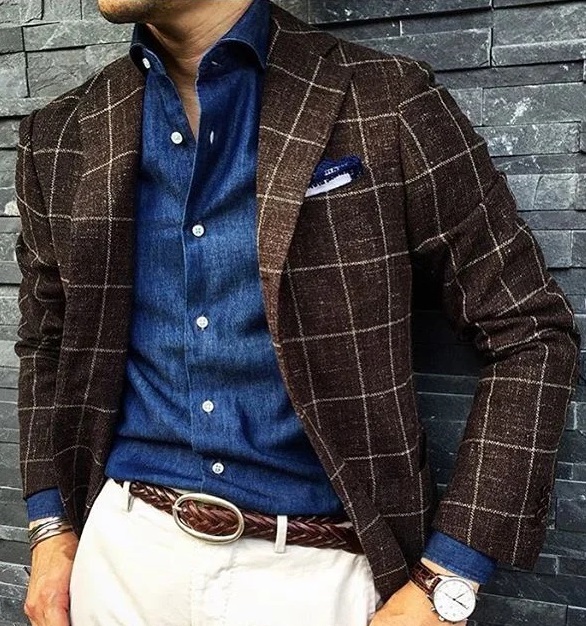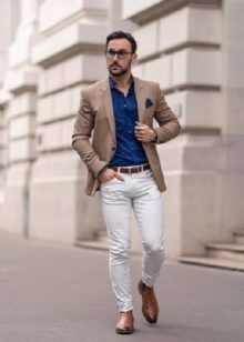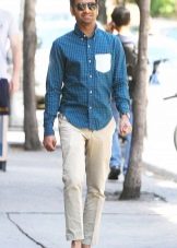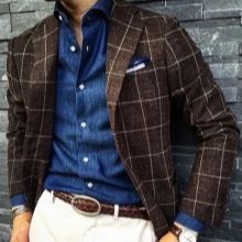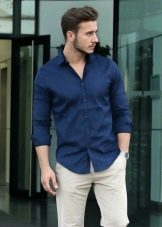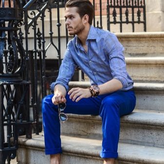 Many interesting solutions can be matched to a men's shirt. bright and catchy cornflower blue... Stylists recommend wearing such a wardrobe item with clothes of neutral and calm tones. An example would be a simple but stylish ensemble of an elongated cornflower blue shirt, a jacket and pearl slacks.