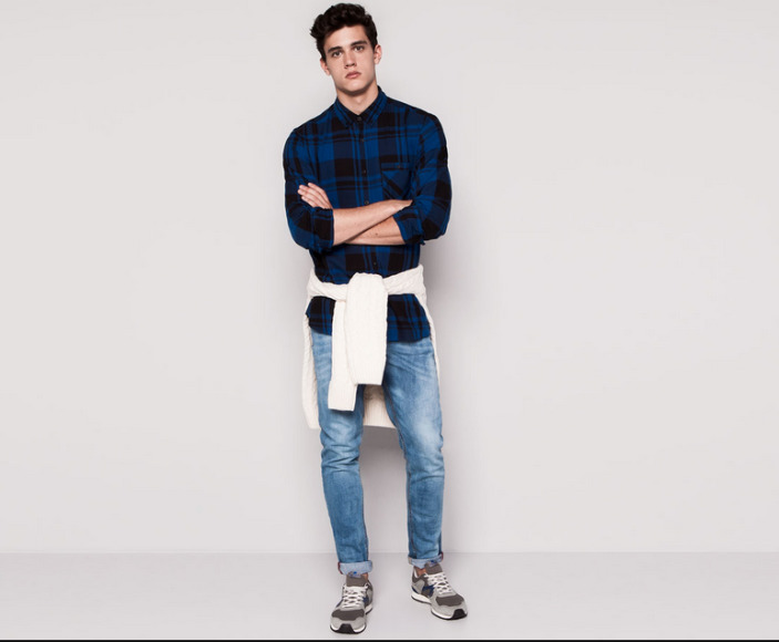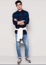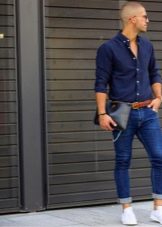 Democratic shirts in a sporty or casual style are usually made from natural or blended fabrics. Such materials have a rough, embossed texture. Stylists recommend combining a blue shirt made from similar fabrics with wardrobe items made from materials with a similar or similar texture. As an example, here is a simple but successful ensemble of a blue cotton shirt, a thin sweater in a neutral color and straight or skinny jeans.