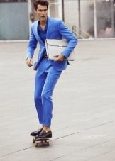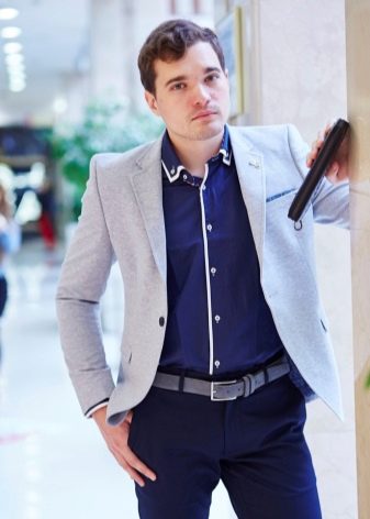 When choosing wardrobe items suitable for a blue shirt, it is worth considering the texture of the material from which it is made. So, models made of noble blue silk are recommended to be combined with classic clothes made of expensive materials (a suit or straight trousers made of fine wool, a jacket made of soft suede or velvet). It is important to note that accessories and footwear for such ensembles should be selected from the appropriate price category.