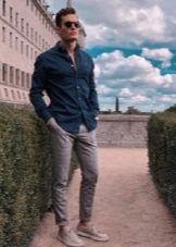 - Sport (sport). Sporty models can have baggy or loose fit, short sleeves, pockets, flaps or other decorative elements. Jeans or loose-fitting trousers, joggers, wide windbreakers are ideal for a blue shirt in a sporty style. Shoes in such ensembles should be sporty, informal (sneakers, sneakers, converse).