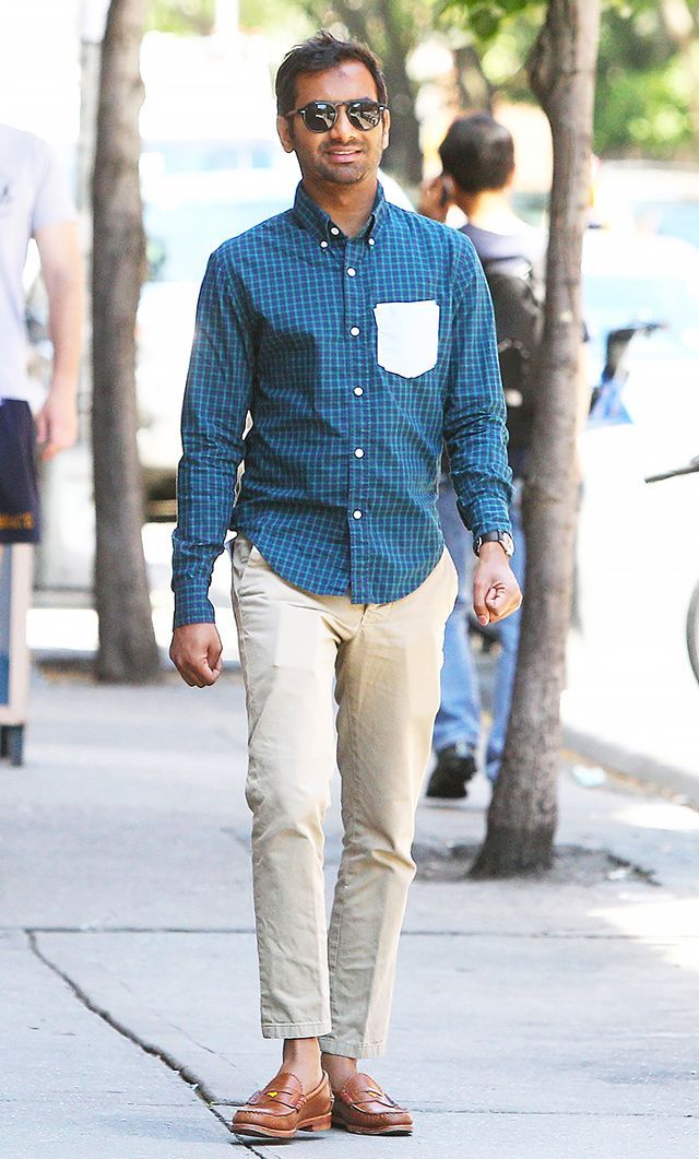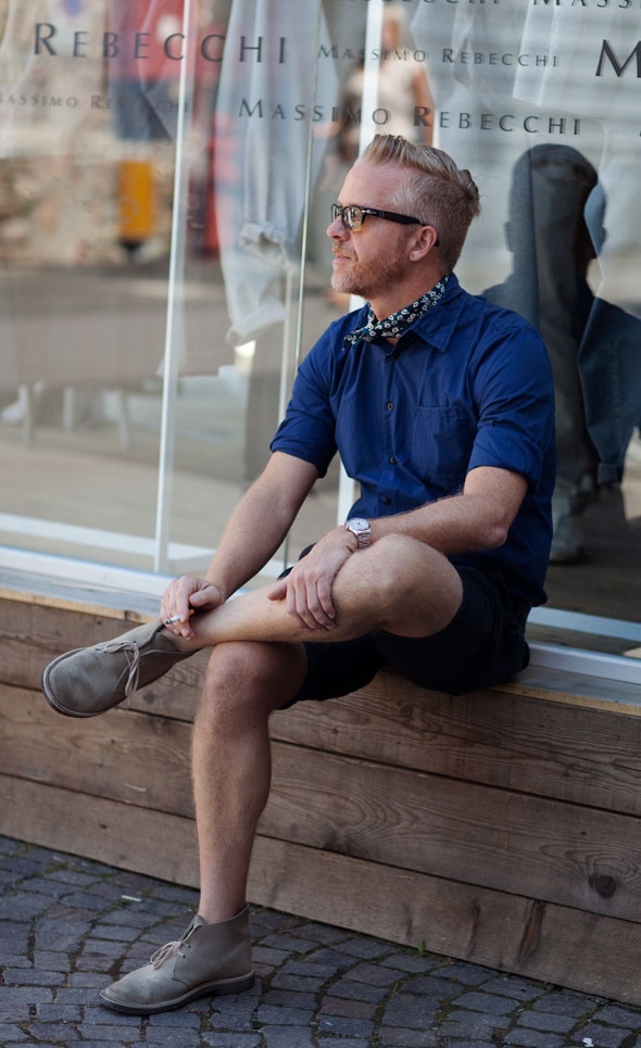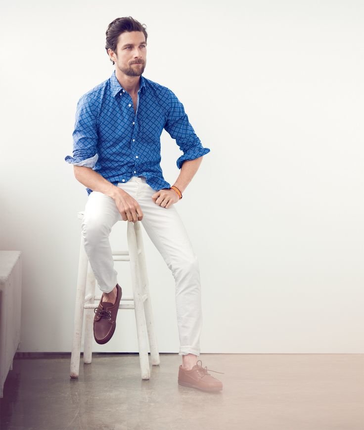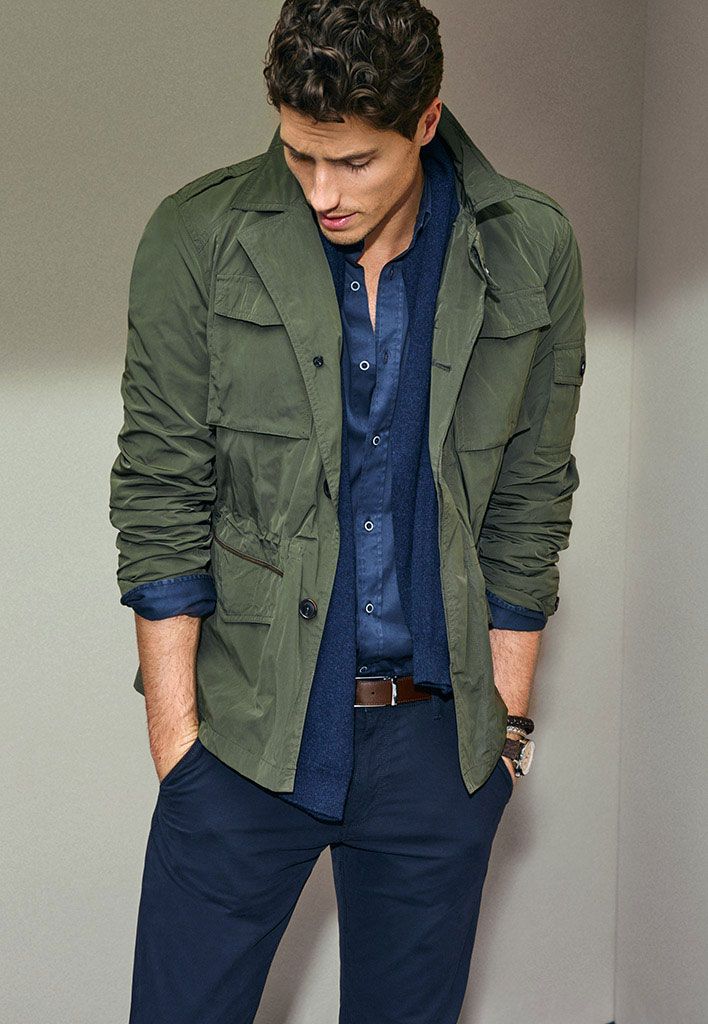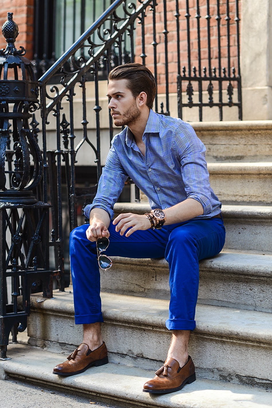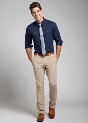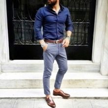 Combinations combining blue and brown shades look very casual. Consider pairing a navy shirt with light coffee or sandy gold dress pants for an easy to wear, everyday look. Comfortable shoes - moccasins or loafers - will organically fit into such an image.