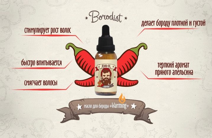 - Calentamiento borodista Es una unidad de cosmética de aseo masculina. El aceite estimula el crecimiento de los pelos, ya que se basa en la pimienta. El uso de este producto proporciona resultados rápidos y de alta calidad.