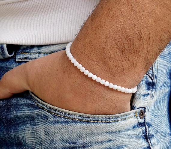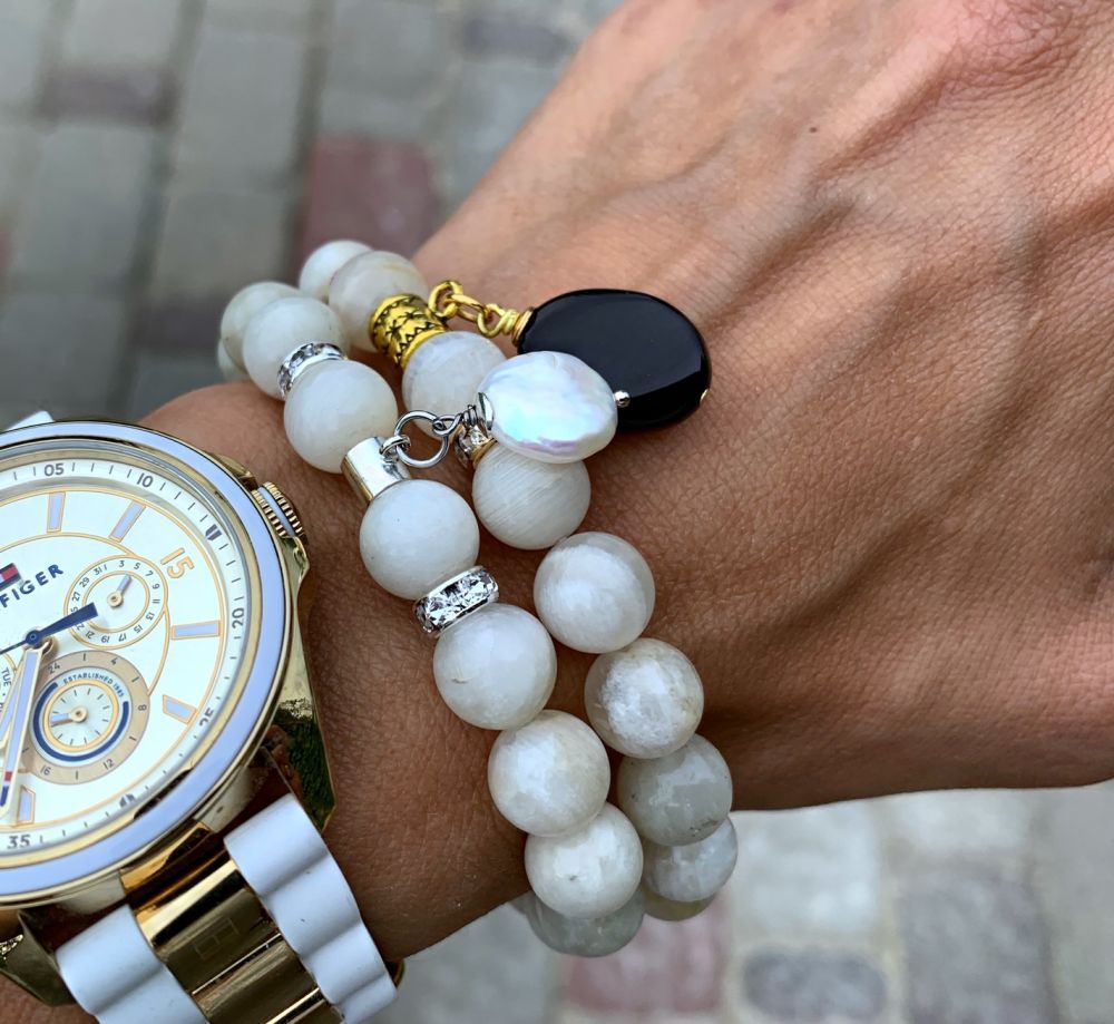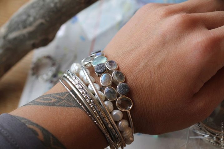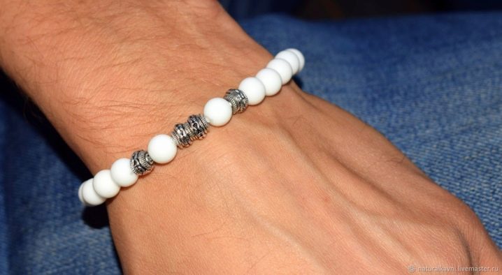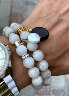 Las pulseras con piedras blancas se consideran universales, porque se pueden usar con cualquier ropa. Las piedras blancas incluyen perlas, cuarzo de leche, ónix blanco.