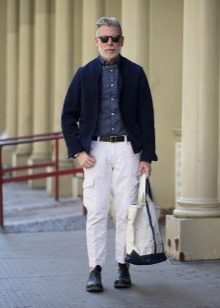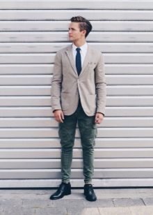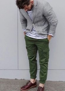 Los diseñadores permiten el uso de pantalones cargo en combinación con una chaqueta, pero en este caso, debe elegir este último con mucho cuidado. Por un lado, un cargo completo con un top clásico es muy impresionante, pero por otro lado, los pantalones militares anchos en este caso serán inapropiados. Es mejor dar preferencia a los pantalones ligeramente cónicos que se ajustarán exactamente a la figura.