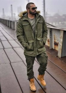 Si ha optado por los pantalones cargo, es hora de pensar qué ropa elegir en un conjunto para algo tan brillante y distintivo. No se olvide del origen militar de la carga, en base a esto, es fácil adivinar que la opción más óptima para ellos será un estilo militar familiar y familiar. Al ceñirse a él al elaborar una imagen general, siempre se verá relevante y apropiado.