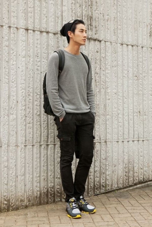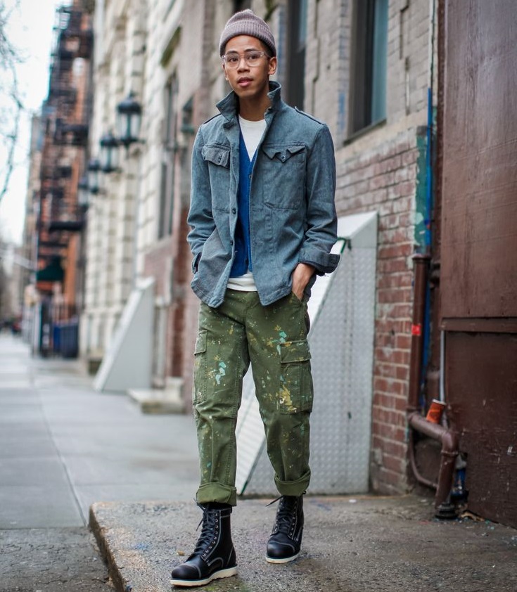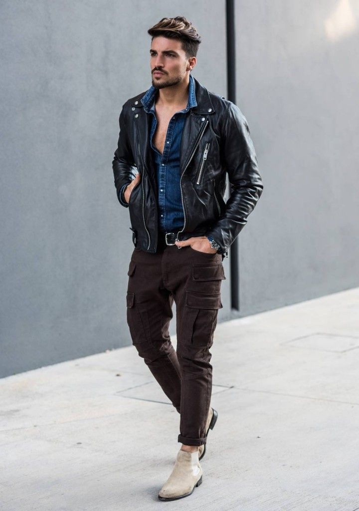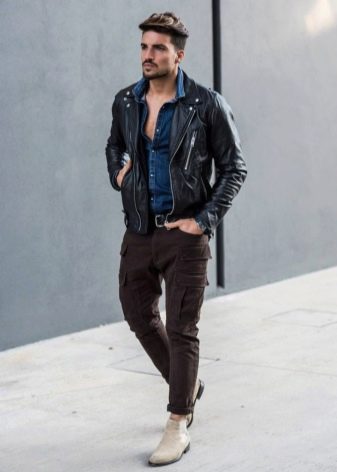 Cargo tiene un carácter verdaderamente universal, por lo que la combinación con cosas que transmiten energía masculina es siempre armoniosa y brutal. Las camisas de mezclilla gruesa, oxford o cambray, así como las chaquetas bomber y los suéteres de punto grueso lucen espectaculares con pantalones cargo.