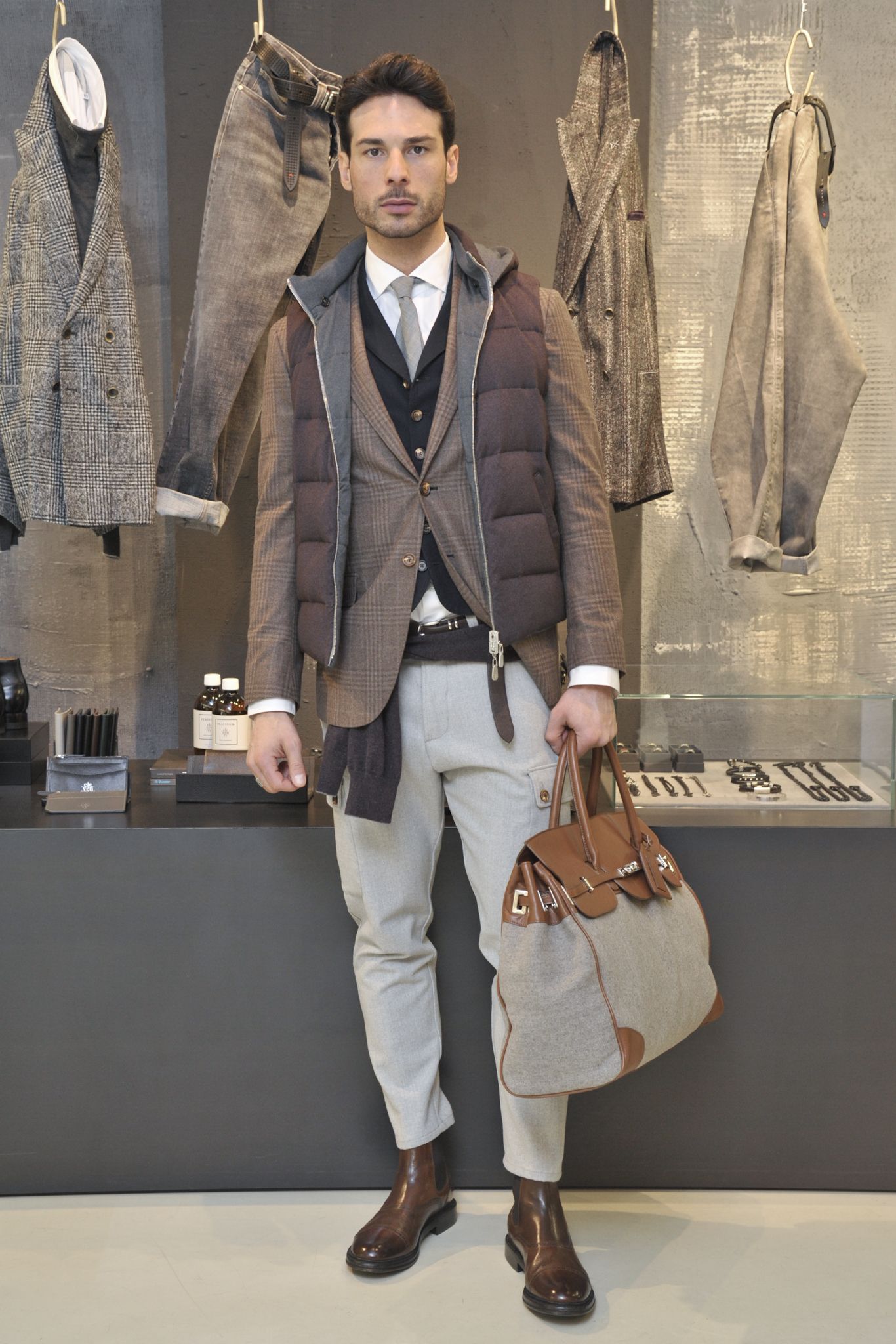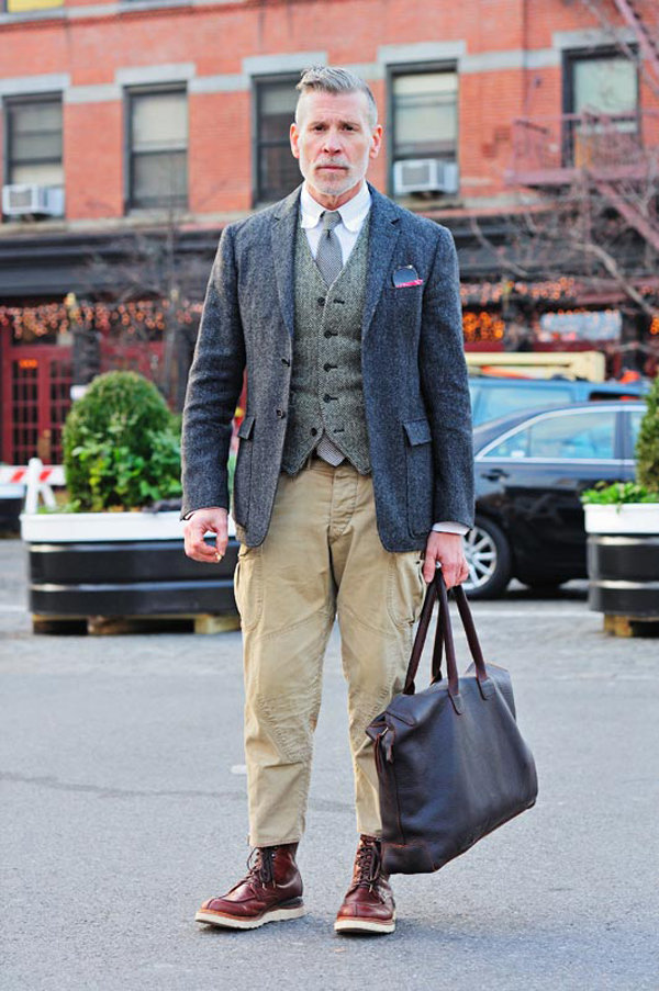 Al combinar un cargo con una chaqueta, en ningún caso debe meterse los pantalones; es mejor domesticarlos a la longitud requerida.