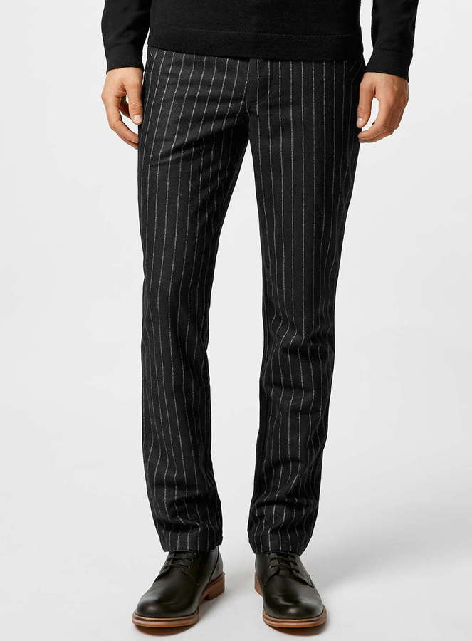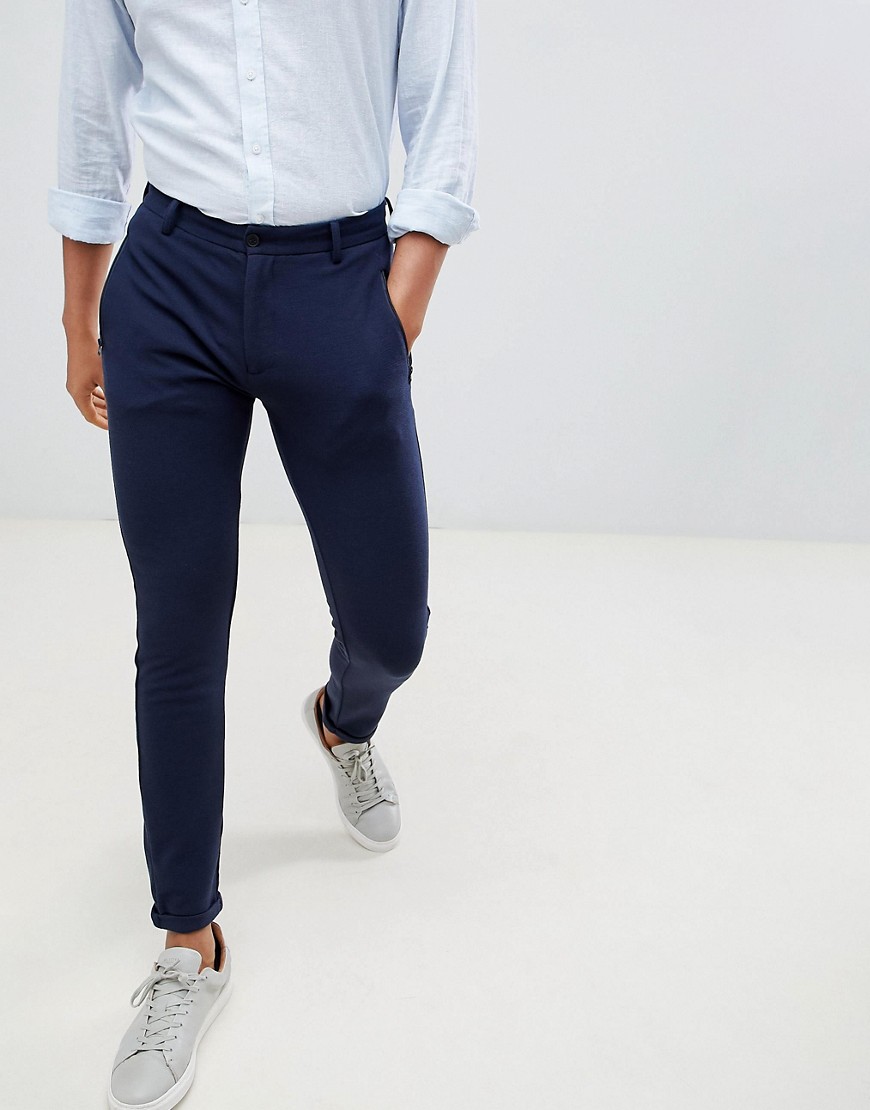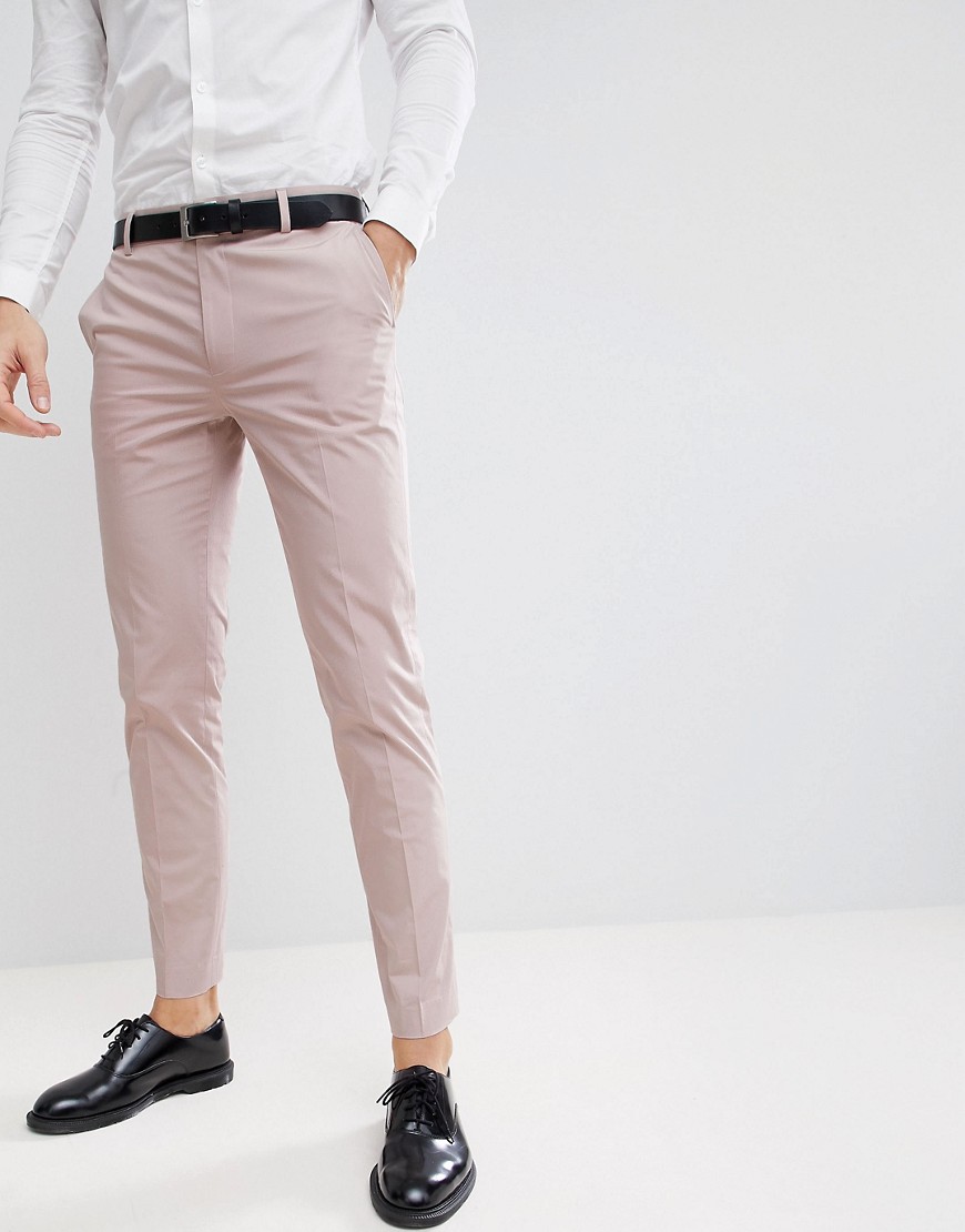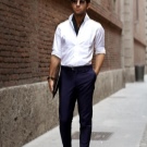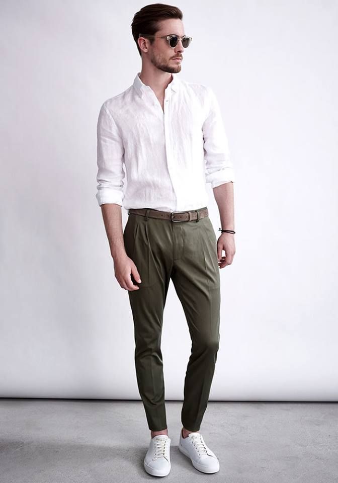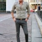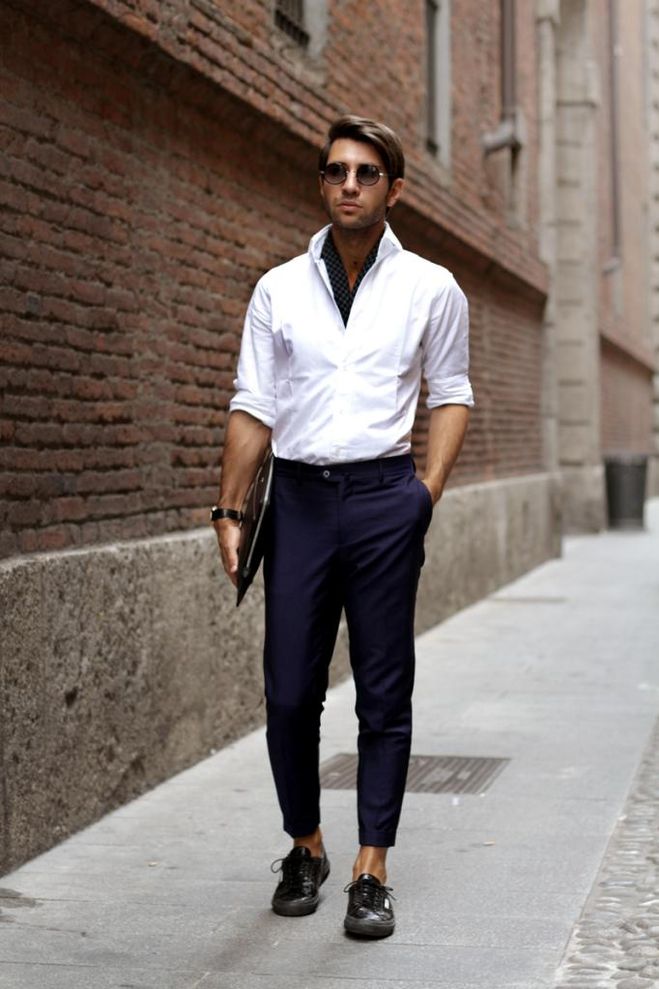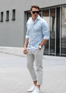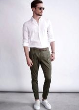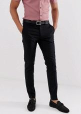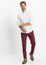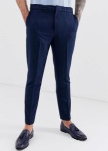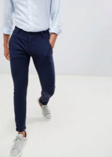Pantalón slim fit - la tendencia más actual en moda masculina. El uso de tejidos elásticos modernos permite producir modelos cónicos que no son típicos de los estilos clásicos habituales. Por el momento, los pantalones ajustados pueden formar parte de un traje de negocios (si son de colores estrictos y están hechos con telas adecuadas), aunque a menudo se usan con camisetas o camisas. Los pantalones cónicos se suelen confeccionar de forma corta o con puños, lo que también es una tendencia actual.