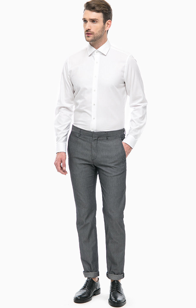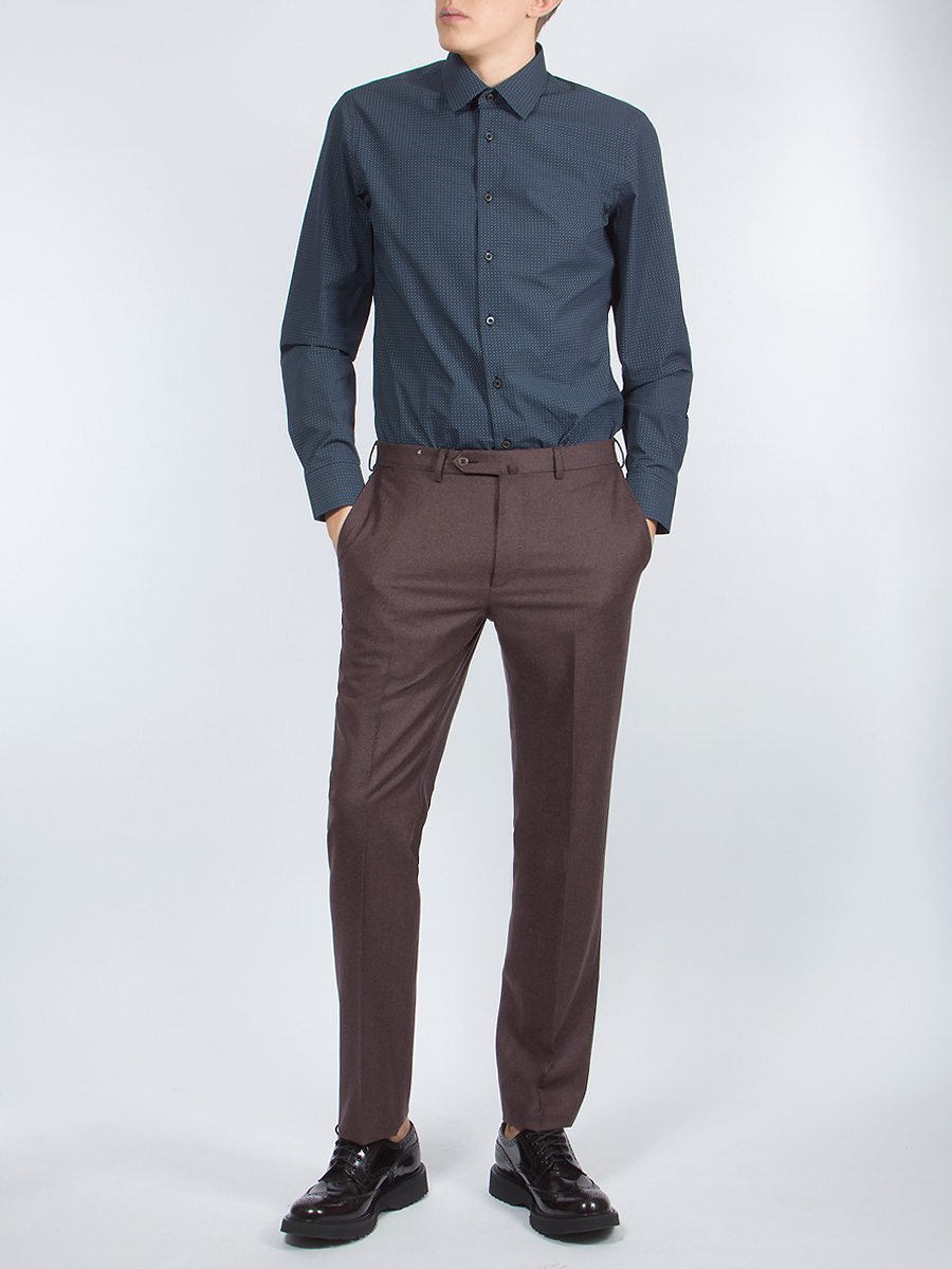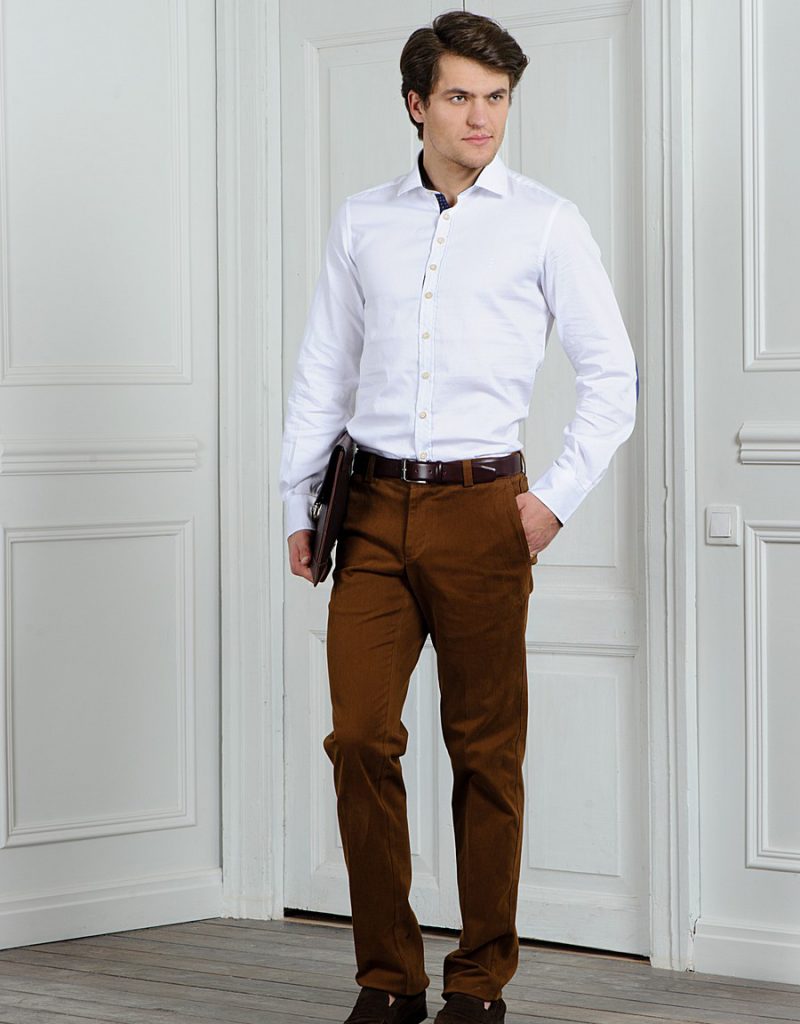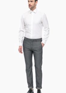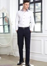 Un par de pantalones de vestir de color carbón o azul marino es imprescindible para cualquier traje formal. Es mejor comprar un pantalón y una chaqueta como conjunto. Es costumbre combinar un traje formal de negocios con una camisa. El color de camisa más versátil que combina con cualquier pantalón y chaqueta es el blanco. El azul es adecuado para un traje azul, gris y negro, mientras que la camisa debe ser más clara que el traje y la corbata debe ser más oscura.Si la ropa exterior está impresa con una tira de luz o una jaula, entonces la camisa se elige para que coincida con la tira, pero sin patrones.