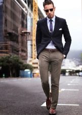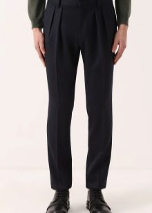 El estilo casual de negocios le permite combinar pantalones clásicos no solo con una chaqueta, sino también con cárdigans, jerséis y camisas. Los modelos con pliegues se recomiendan para hombres con sobrepeso, ya que los pliegues debajo del cinturón pueden ocultar la imperfección de la figura, y también hacer que la cosa sea cómoda de llevar debido a la mayor amplitud. Para los hombres de complexión delgada, puede elegir pantalones de talle bajo sin pellizcos, los de talle medio con un pellizco también son adecuados, pero es mejor ignorar las opciones con dos pliegues en los lados.