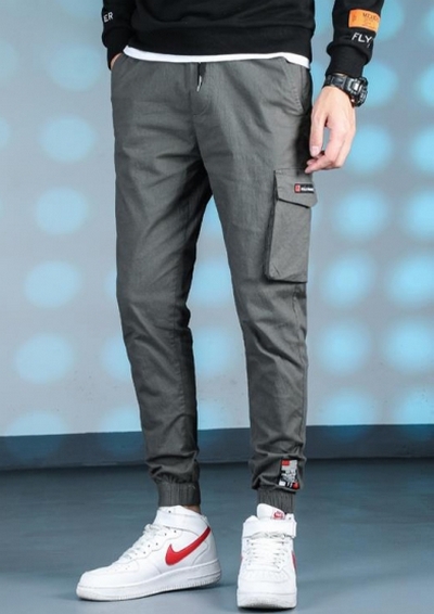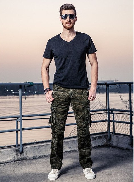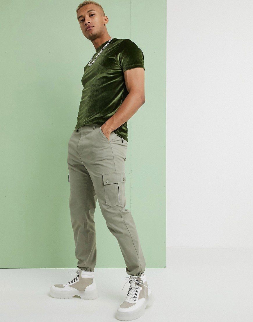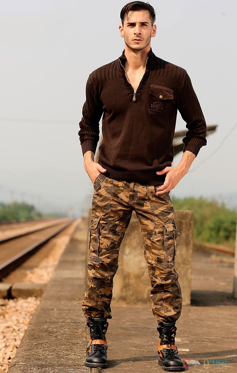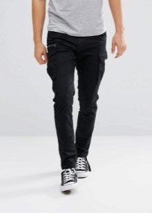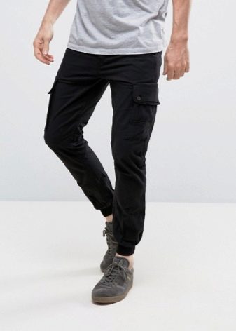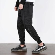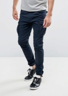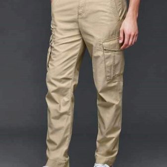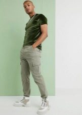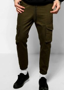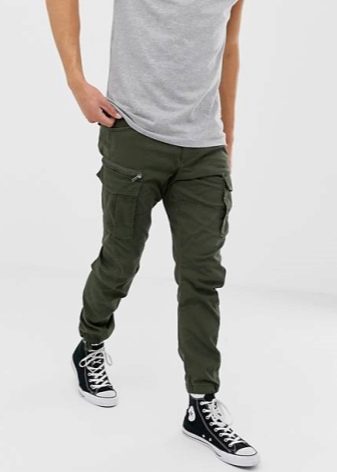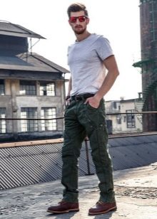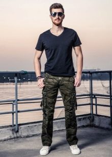 - Carga. Este modelo de pantalón es líder absoluto en la moda masculina de estilo soldado. Son pantalones holgados con gran cantidad de bolsillos de parche. Cargo está cosido a partir de lienzos completamente naturales en una paleta de color marrón pastel, aunque se permite el uso de colores verde, gris e incluso nude. Los modelos negros y azul oscuro se ven muy impresionantes: estos pantalones se pueden combinar con cualquier ropa.