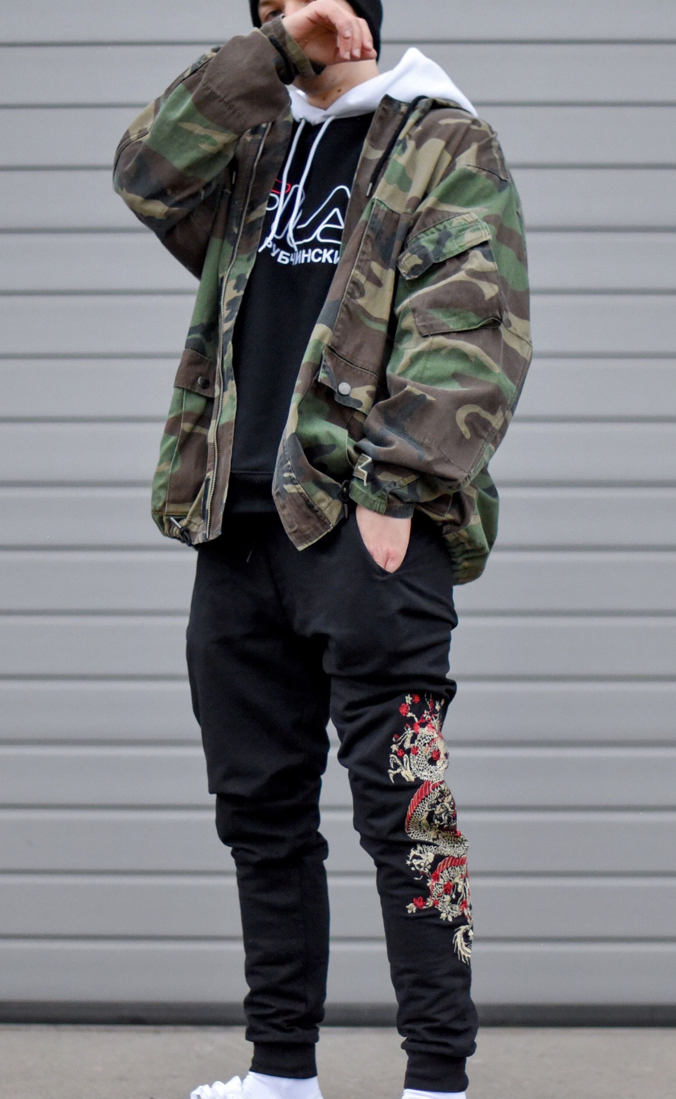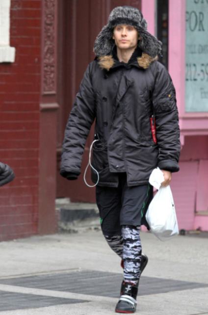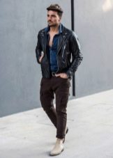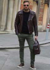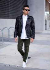 Un tándem exitoso con pantalones decorados con un estampado de un bosque de hoja caduca es una chaqueta de cuero negro, pero solo si se usa una camiseta o camisa en un tono brillante y contrastante debajo de la chaqueta.