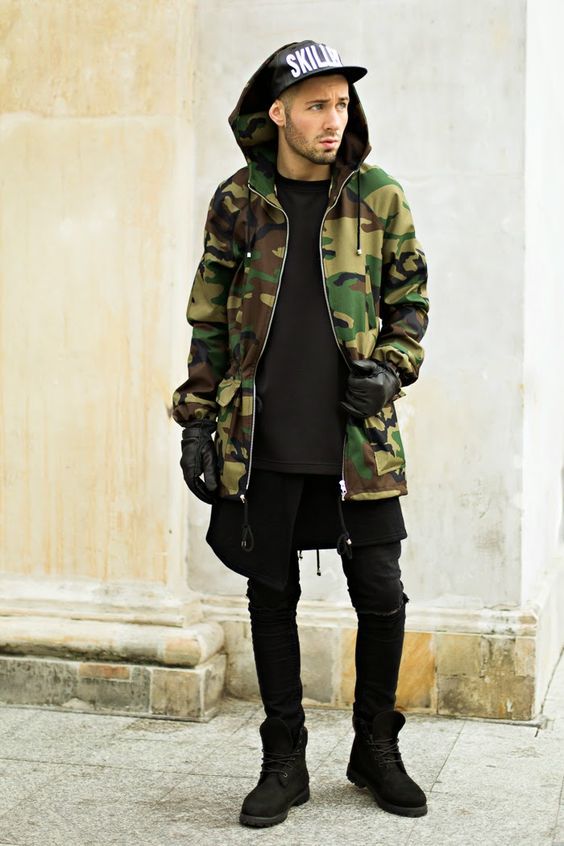 Es muy importante elegir tus zapatos. Los botines con suela maciza con protector se combinan de manera más armoniosa con estampados de camuflaje.