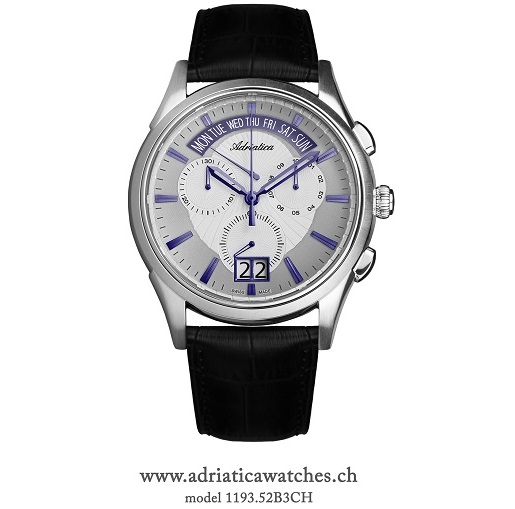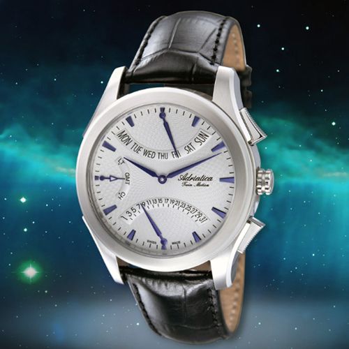 - Movimiento gemelo Adriatica Es una gran opción para viajeros de negocios y de placer. El elegante accesorio permite realizar un seguimiento del tiempo en diferentes latitudes. Ideal para personas que a menudo tienen que viajar a otros países y cambiar de zona horaria. El diseño de este modelo es aristocrático, está equipado con un movimiento de cuarzo Soprod E06. En la parte posterior del cronómetro hay un logotipo de la marca en forma de un monograma impecable. Una correa de cuero negro con una hebilla clásica le da al dispositivo un aspecto sólido. Gracias a él, el accesorio luce aún más elegante. La protección contra la humedad es de 100 M. Diámetro de la caja 46 mm, espesor - 13 mm. El diseño lacónico le permite combinar este reloj con trajes de negocios.