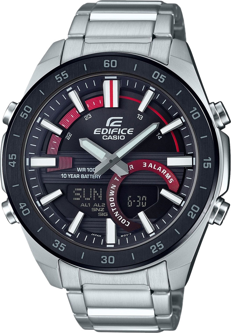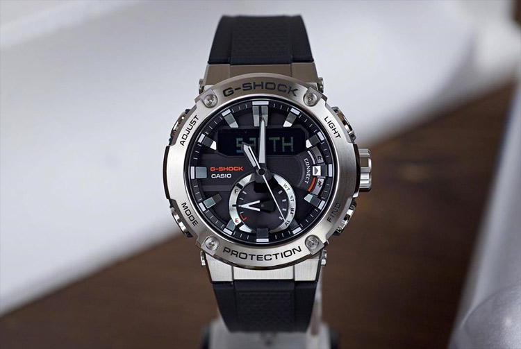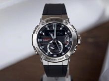 Modelo Casio G-SHOCK GST-B200-1AER con cronógrafo también es una opción interesante, tiene un movimiento tipo cuarzo y es alimentado por una batería solar de alta potencia. El trabajo es suficiente durante 6 meses sin recargar. Equipado con una carcasa a prueba de golpes que protege contra vibraciones y daños mecánicos. Gracias a la iluminación dual, el dial es claramente visible en condiciones de poca luz, y cuando gira la muñeca, la iluminación adicional se enciende automáticamente. El revestimiento de acumulación de luz se refleja en la oscuridad incluso después de una breve exposición a la luz. Gracias a la tecnología inalámbrica Bluetooth, es posible sincronizar con un teléfono inteligente. El modelo se conecta automáticamente al servidor horario a través de un teléfono inteligente, cambia automáticamente al horario de verano e invierno. La caja está hecha de acero y la pulsera está hecha de plástico.