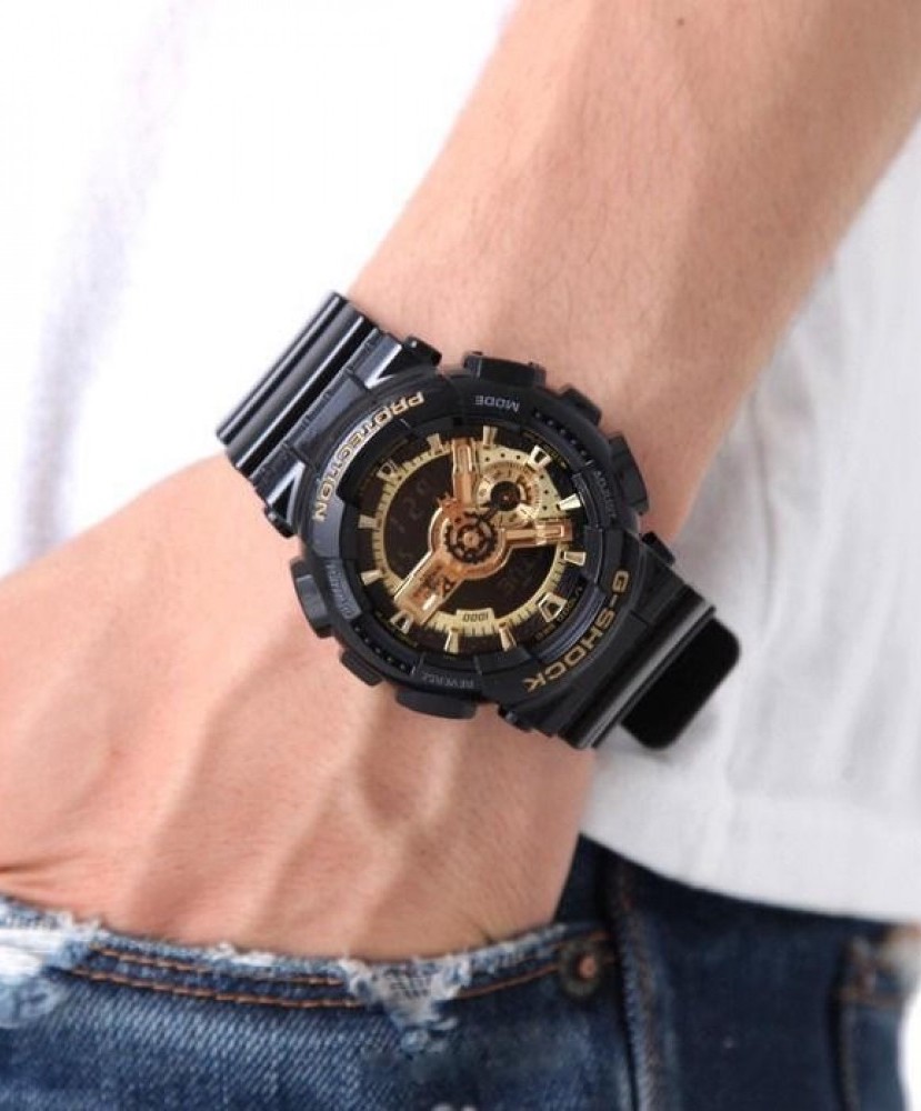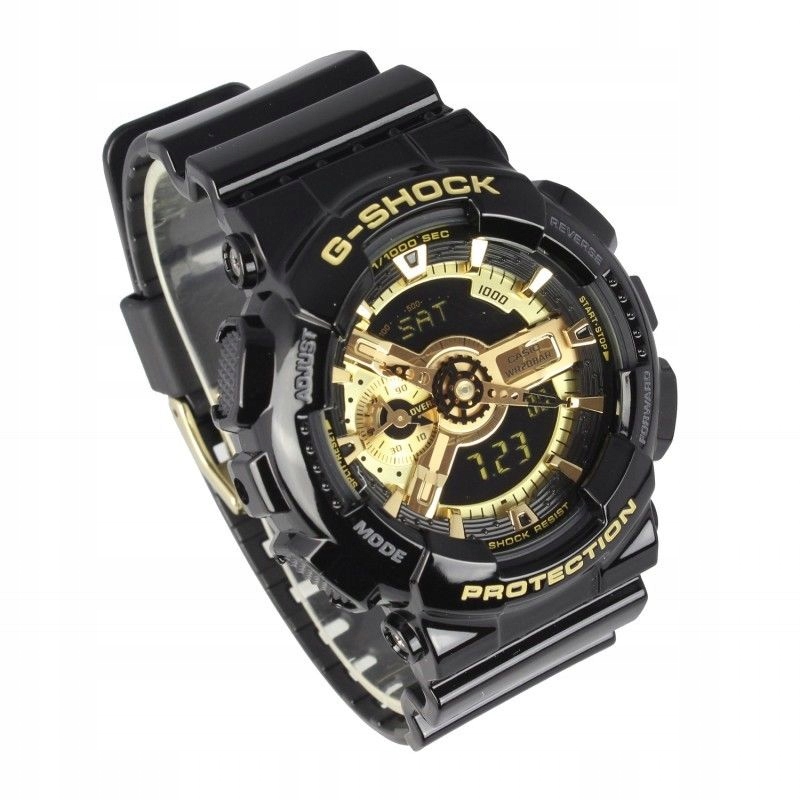 Desde modelos modernos para hombres, puede dejar de prestar atención Casio G-Shock GA-110GB-1AER... Este modelo está fabricado en color negro y la caja está fabricada en metal polímero. El preciso movimiento de cuarzo está resaltado en color dorado. Se utiliza una batería como fuente de alimentación. El mecanismo está firmemente protegido por vidrio mineral. El modelo para hombre está repleto de funciones útiles. Se trata de una luz de fondo automática que se enciende cuando se baja la manecilla, una alarma diaria, una alarma por hora, visualización de la hora en cualquier zona del mundo, un temporizador de cuenta regresiva, acompañado de una señal de sonido.