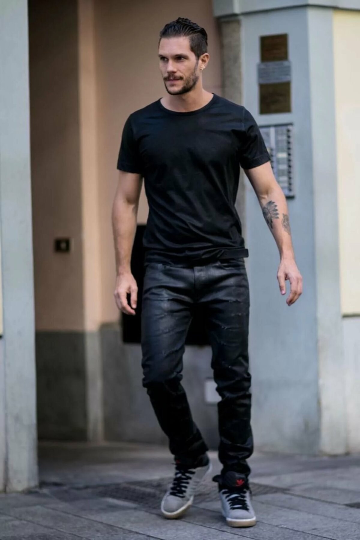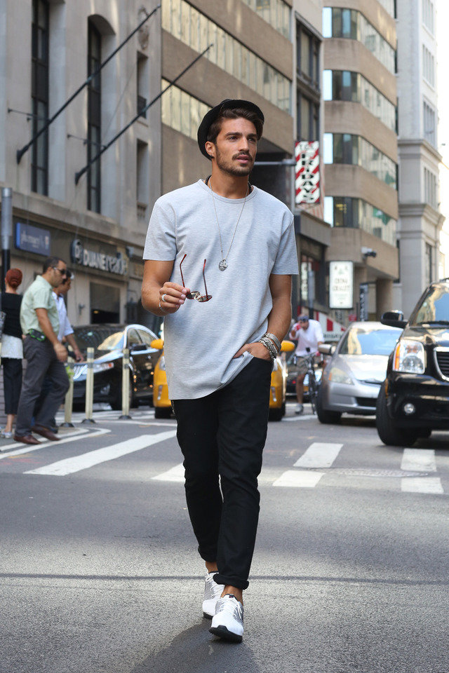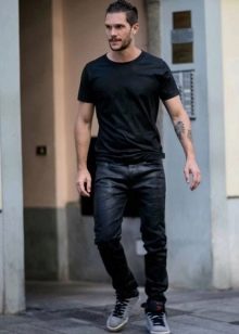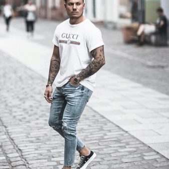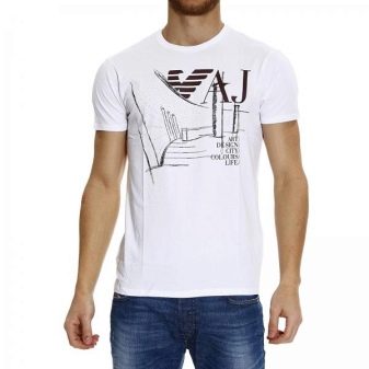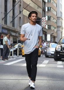 Aspecto diario estándar, que se encuentra con mayor frecuencia en las calles de la ciudad. Una camiseta blanca con el logo de la famosa marca italiana Emporio Armani se complementa con unos vaqueros desgastados de color azul oscuro. Los extremos están ligeramente doblados, como es ahora la práctica entre los jóvenes. Zapatillas blancas con cordones completan el look.