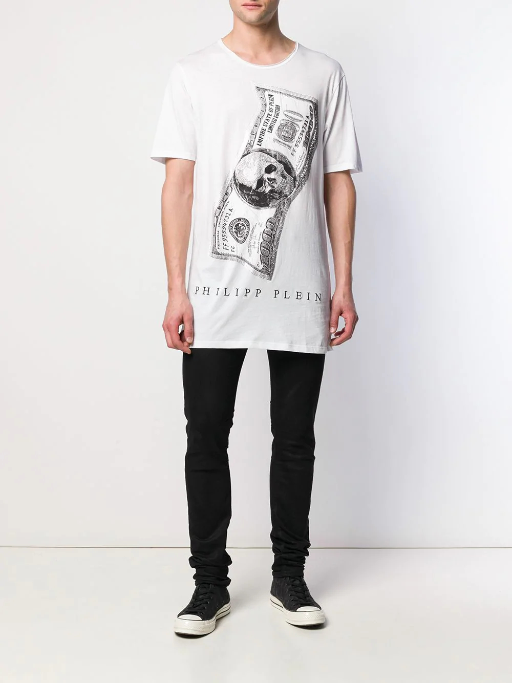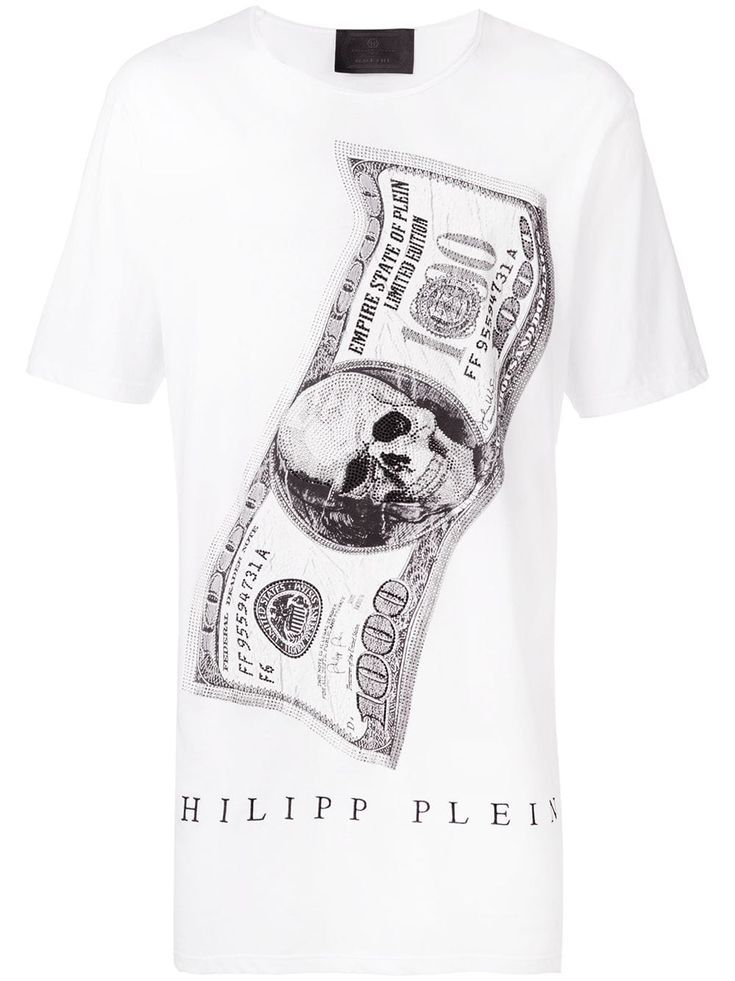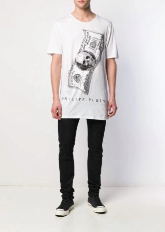 La camiseta original de Philipp Plein parece bastante orgánica en este caso. La camiseta blanca está adornada con un gran billete de 100 dólares, que en lugar de Washington es el estampado característico de la marca. Debajo hay una inscripción con un logo. Dado que la camisa en sí es lo suficientemente brillante, a pesar de los colores clásicos, complementarla con jeans negros fue la decisión correcta. Complementa este look con zapatillas blancas y negras.