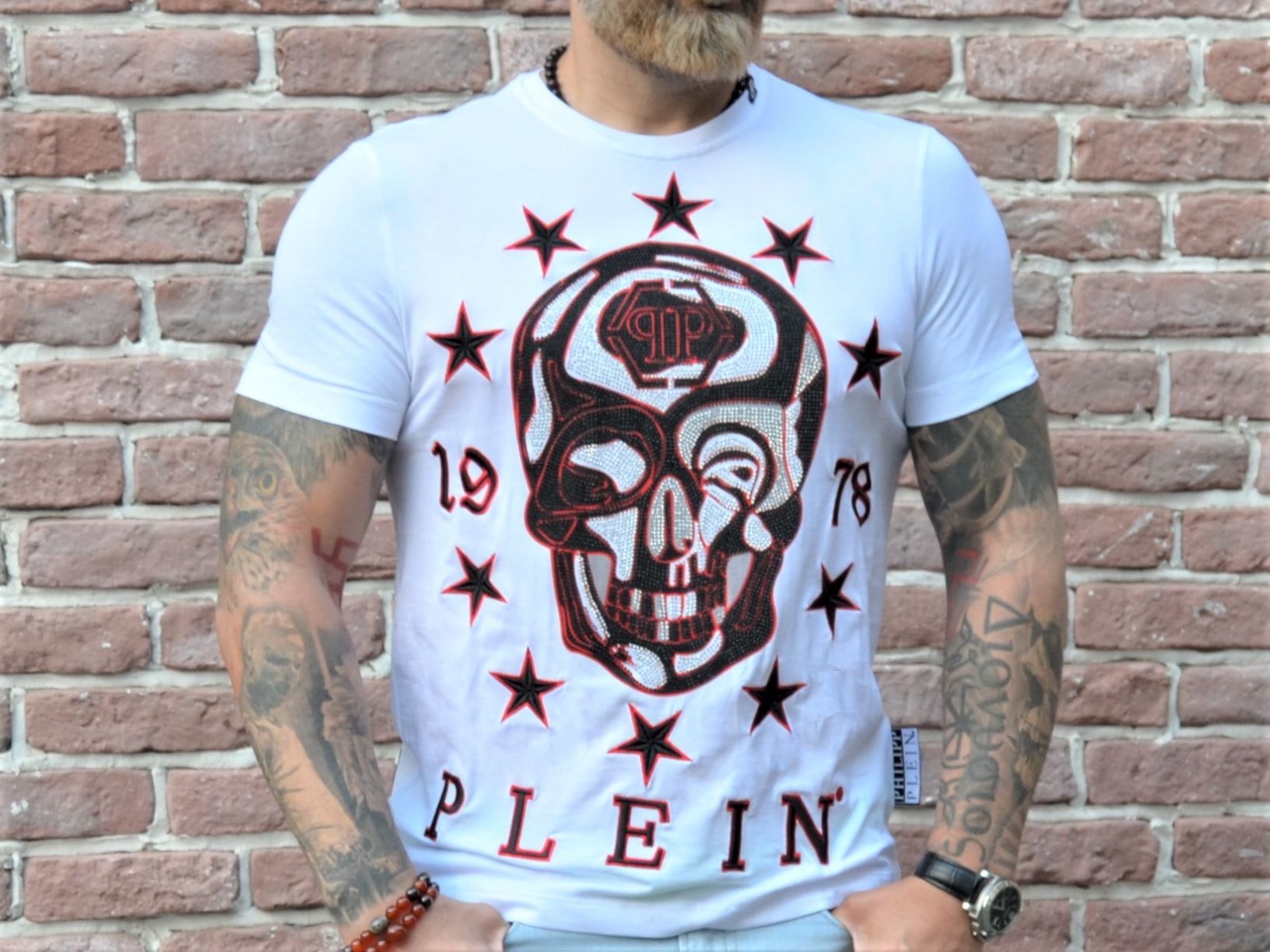 Phillip Plain, conocido por sus extraordinarias colecciones y su querido estampado de calaveras, ha creado una serie similar de camisetas. Los productos se presentan en dos colores: blanco y negro. Generalmente, en el centro de la camiseta luce una gran calavera con el logo de la marca... Está decorado con remaches, espinas o pedrería. Hay productos con pequeños dibujos por toda la zona. Puedes encontrar modelos totalmente adornados con el logo de la marca PP.