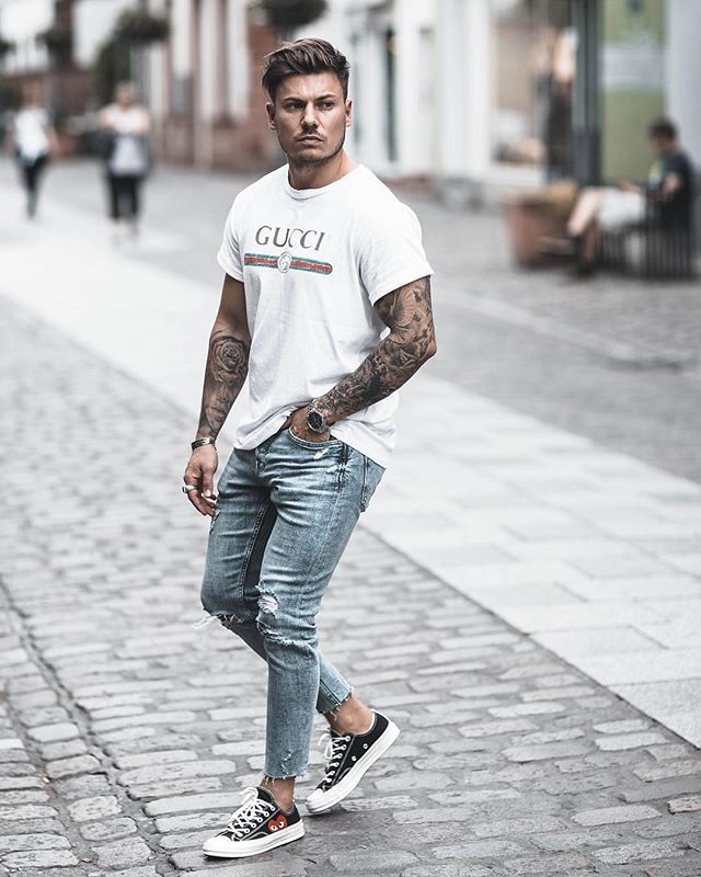Un gran outlet diario de una marca italiana. Una camiseta blanca con un logotipo de Gucci llamativo hace alarde de un corte ajustado a pesar de un ajuste holgado. Los jeans ajustados rotos son otro elemento básico del guardarropa esta temporada. Zapatillas negras con suela blanca y estampado rojo complementan el look a la perfección. El toque final fueron los relojes de oro y las joyas.
