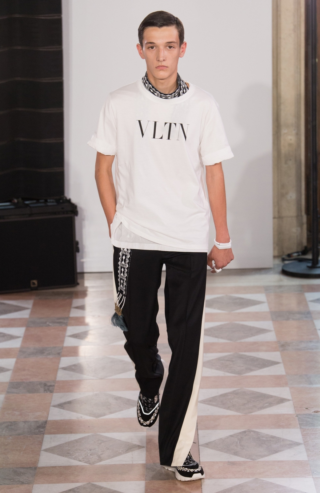 Un look deportivo interesante. La camiseta blanca con el logo de la marca francesa está decorada con un original estampado en la zona del cuello en forma de cadena de metal retorcida alrededor del cuello. Los pantalones negros con rayas blancas a los lados tienen pequeñas aberturas. Zapatillas blancas y negras y un reloj completan el espectáculo.