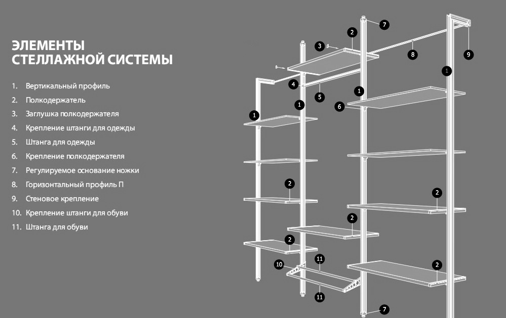 El conjunto con balda de 400 mm es el producto más demandado de Larvij. El precio de dicho sistema de bastidor es de 9990 rublos, que incluye 6 bastidores, 2 rieles, 2 varillas, 9 soportes, 3 soportes y sujetadores.
