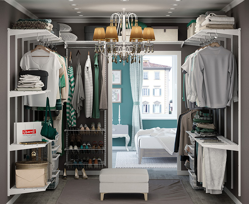 Las características de los sistemas de vestuario se encuentran en el uso de materiales y componentes seguros en el proceso de fabricación de productos, la confiabilidad de los accesorios de los muebles y la facilidad de ensamblaje de la estructura. Larvij también produce una amplia variedad de sistemas de vestuario. A su discreción, puede recoger mallas, cestas de malla fina, equipar el vestidor con barras para perchas y estantes extraíbles.