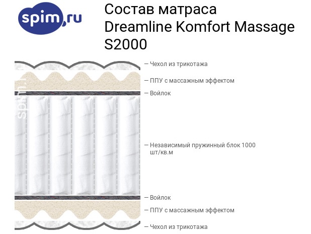 El colchón DreamLine Natural Space Massage S2000 tiene una firmeza media. Consta de bloque de resorte C2000. La altura del colchón es de 22 cm, la carga máxima en una litera es de 160 kg. El número de resortes por metro cuadrado es de 1000 piezas.
