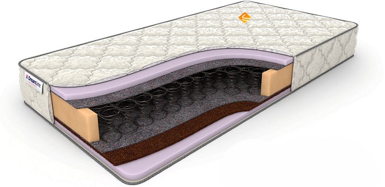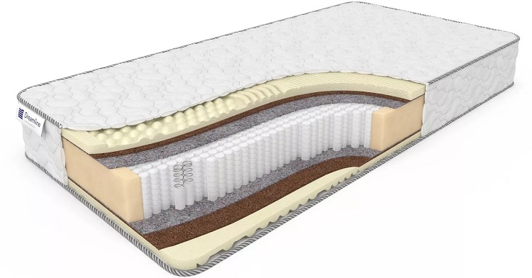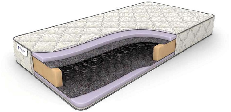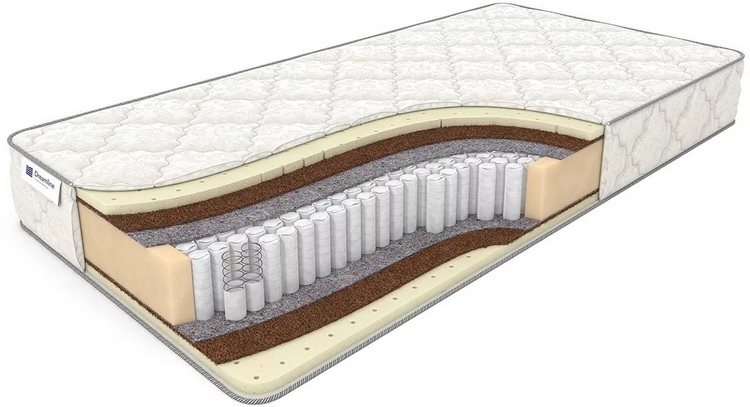 Cada resorte está cubierto desde arriba y desde abajo con una densa capa de fieltro térmico. Cada lado del colchón difiere en composición y grado de firmeza. En una zona de dureza media se utiliza un biocorte, que se basa en corteza de coco, que distribuye el peso por toda la zona.