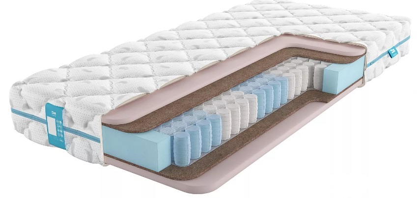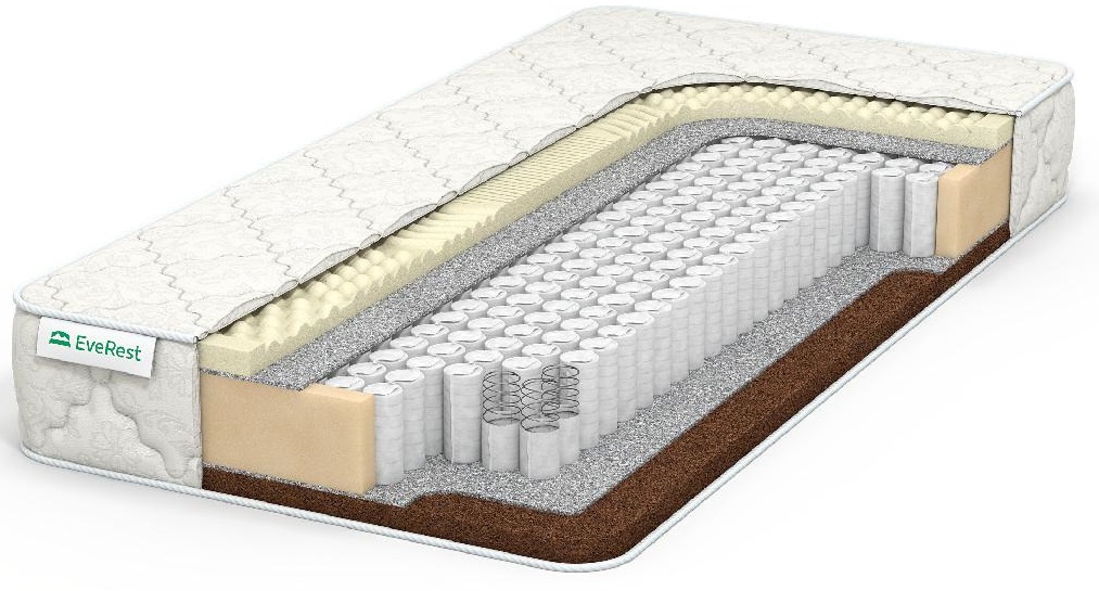 - Everest multiespectral coco / látex. Colchón multifamiliar de doble cara sobre unidad autónoma de muelles de 7 zonas, revestida con una funda de jacquard. El producto tiene un excelente rendimiento ortopédico, así como un efecto de masaje pronunciado. La altura de la estructura para dormir alcanza los 21 cm y la carga máxima es de 130 kg.