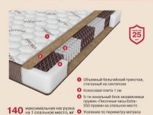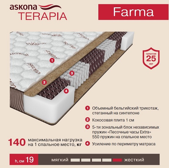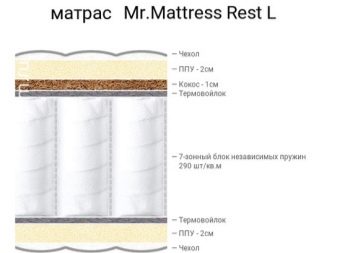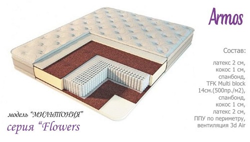 El modelo se puede clasificar como caro. La peculiaridad del colchón es la construcción, en medio de la cual hay una fibra de coco, y en los lados, espuma artificial italiana. El colchón ayuda a relajar los músculos, apoya de manera confiable la columna vertebral.