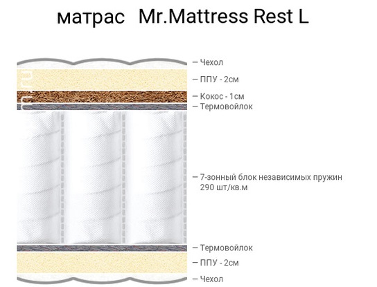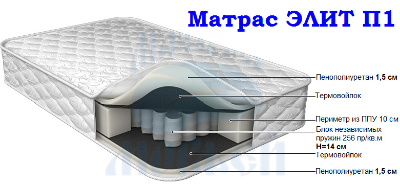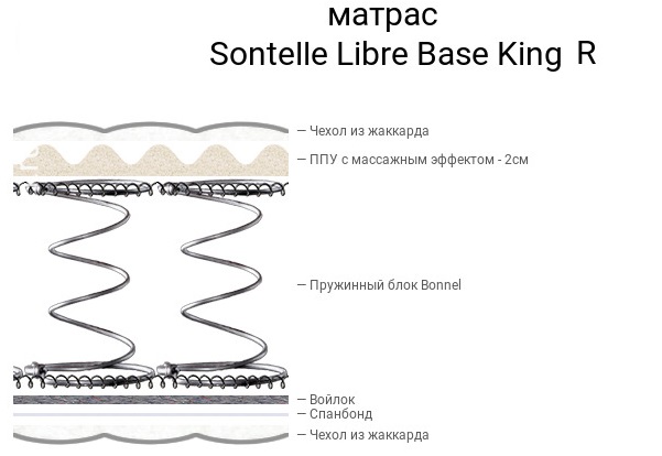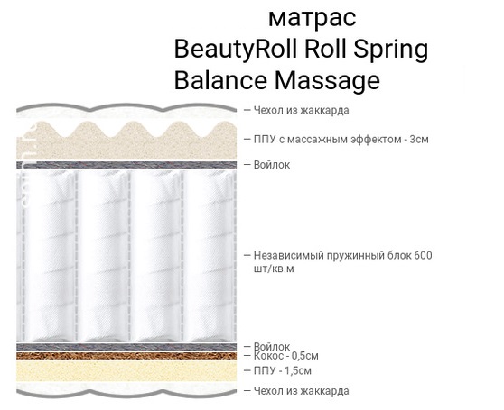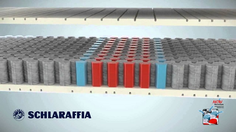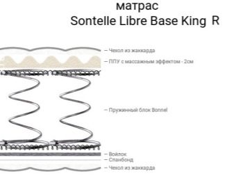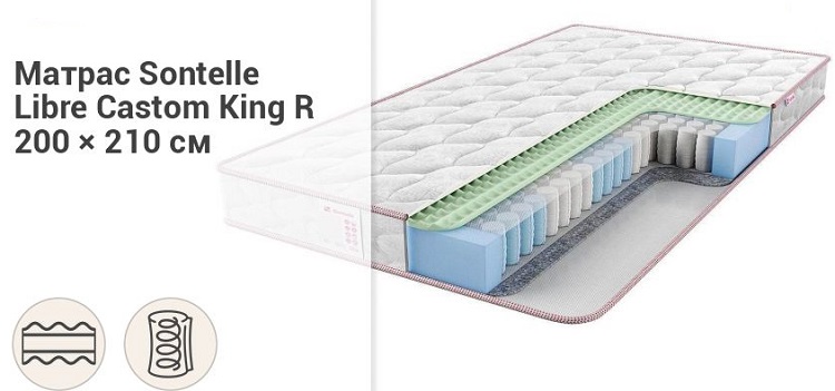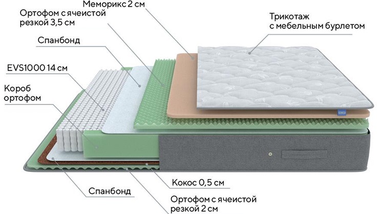 El colchón tiene dos lados de trabajo de diferente dureza: medio y blando. Esto se consigue gracias a una capa de fibra de coco y espuma de poliuretano. La base del colchón está formada por muelles de siete zonas. Una litera puede transportar hasta 120 kg de peso.