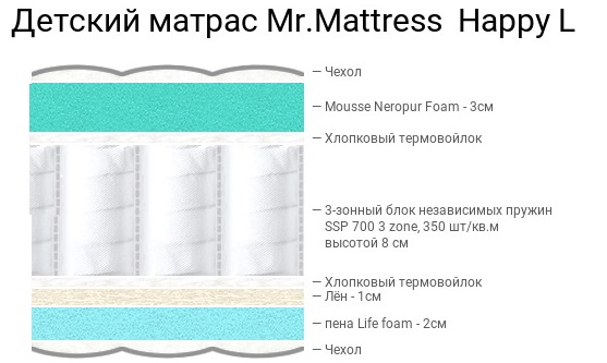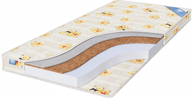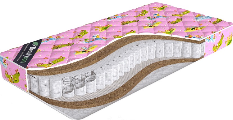 Modelo de segmento de bajo precio para bebés de 3 a 7 años. El colchón es de firmeza media. El relleno principal es una losa de fibra de coco, rodeada por ambos lados por capas de látex natural.