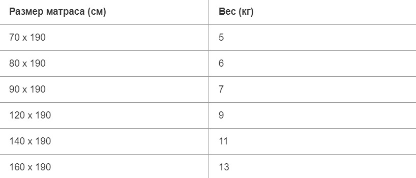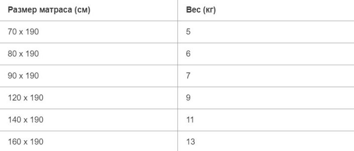 - Relativamente ligero. El peso del producto está directamente influenciado por sus dimensiones (largo, ancho y alto). Dependiendo de estos parámetros, el peso de los colchones oscila entre los 5 y los 15 kg.