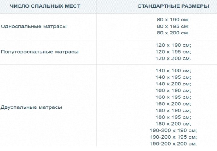 - medidas de colchones para camas individuales: 70x190, 80x190 (80x200), 90x190 (90x200) cm;