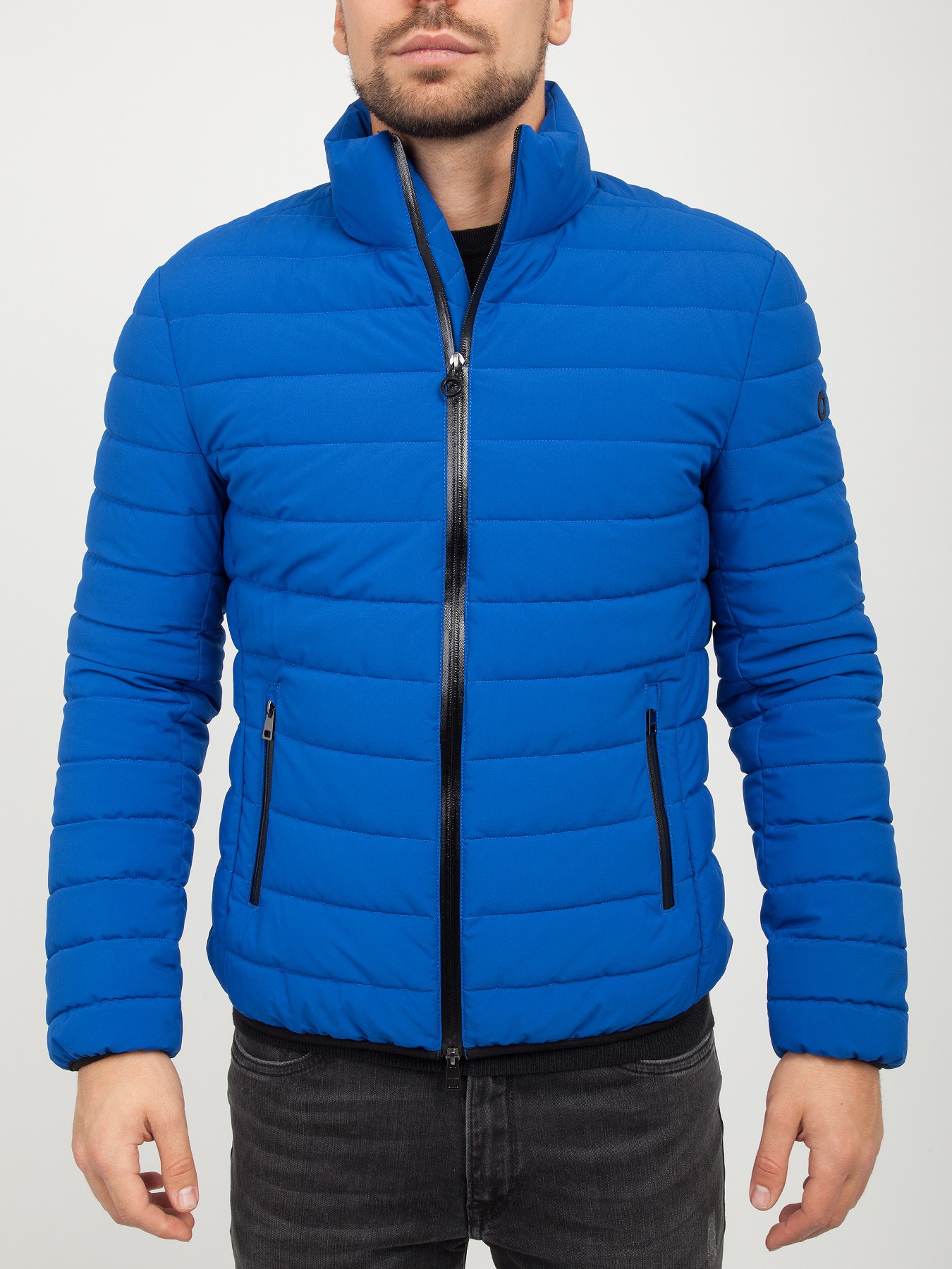 Una chaqueta acolchada de color azul brillante (bomber o chaqueta de plumas) complementada con jeans de corte recto gris perla y un suéter de cuello alto negro es adecuada para crear un aspecto brillante y no estándar. Este conjunto es ideal para el entretenimiento activo al aire libre.