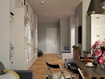 - Por cierto, el pasillo, especialmente lo suficientemente ancho, también puede ayudar a expandir la sala de estar: solo hay que demoler la partición que los separa.