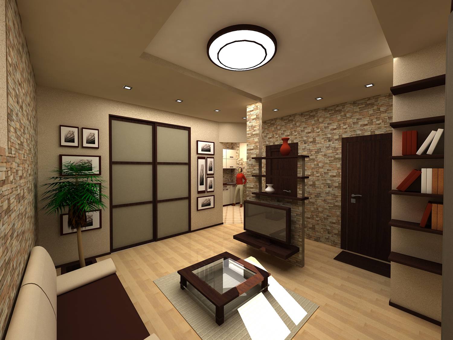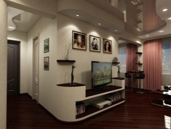- Convertir el pasillo en una sala de estar... Una forma un poco inusual, pero bastante funcional. Si usted es el feliz propietario de un apartamento con una gran área cuadrada y un amplio vestíbulo de entrada, puede equipar la sala de estar allí mismo: instale un armario cerca de la puerta de entrada, donde pueda "esconder" ropa de abrigo, bolsos y zapatos en el entrada, y poner un sofá un poco más lejos (puede ser muy pequeño), por el contrario, colgar un televisor en la pared.