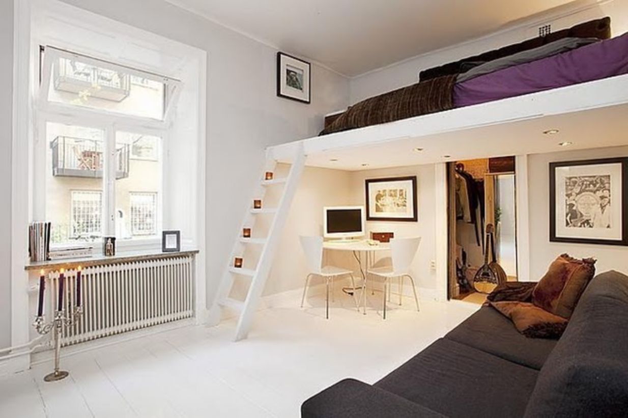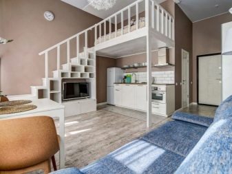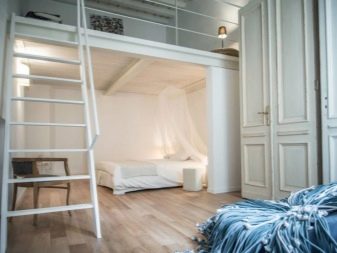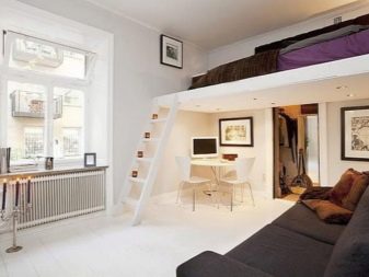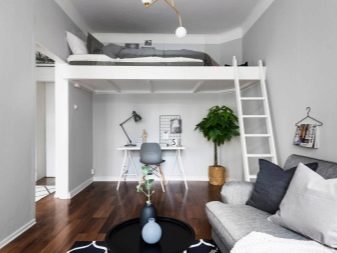- Colocar un área para dormir en el segundo nivel.... Adecuado solo para locales residenciales con techos muy altos, al menos 3 metros. Un cierto "segundo piso" está equipado con una escalera donde se instala la cama. El espacio que quedará debajo está destinado a la sala de estar.