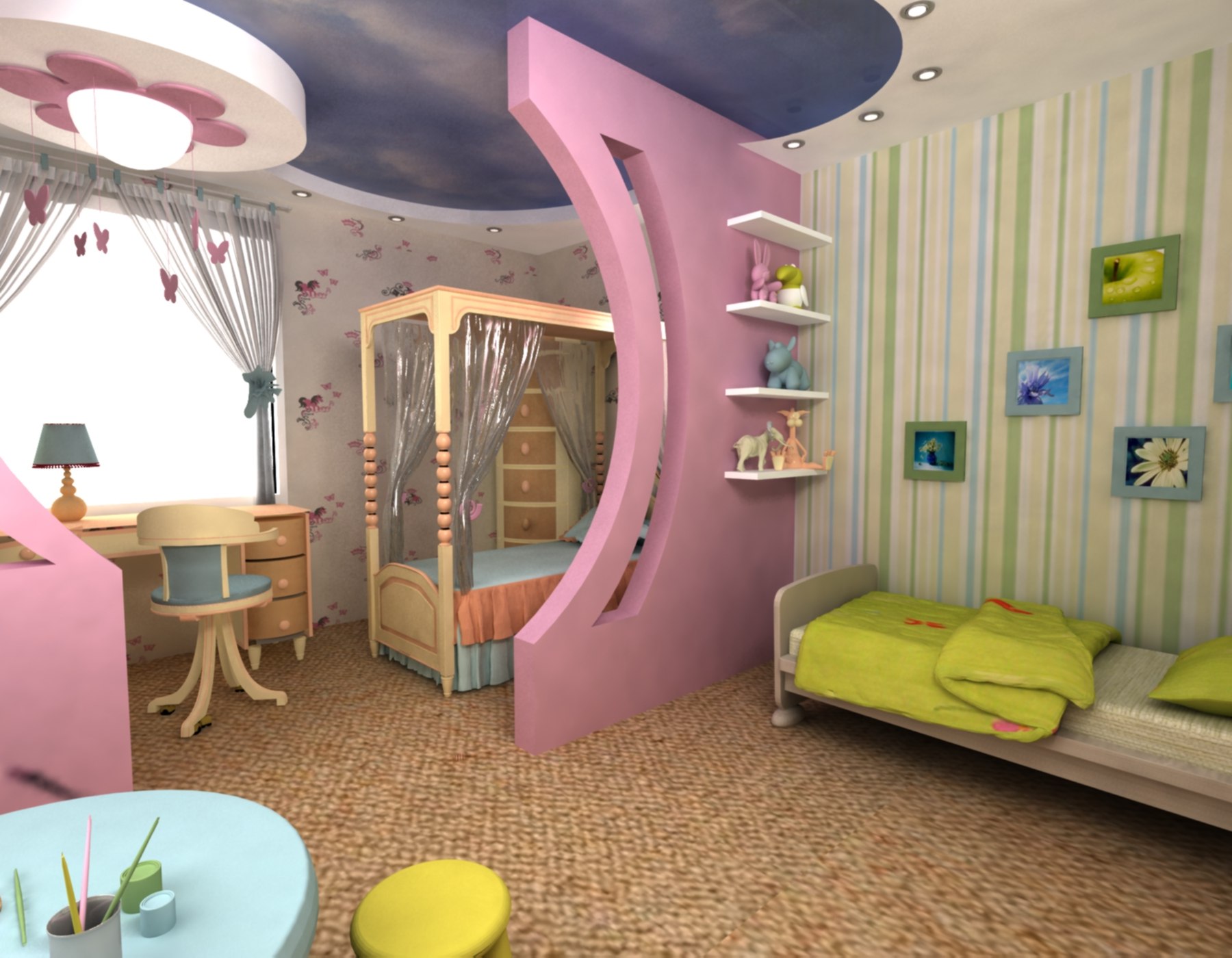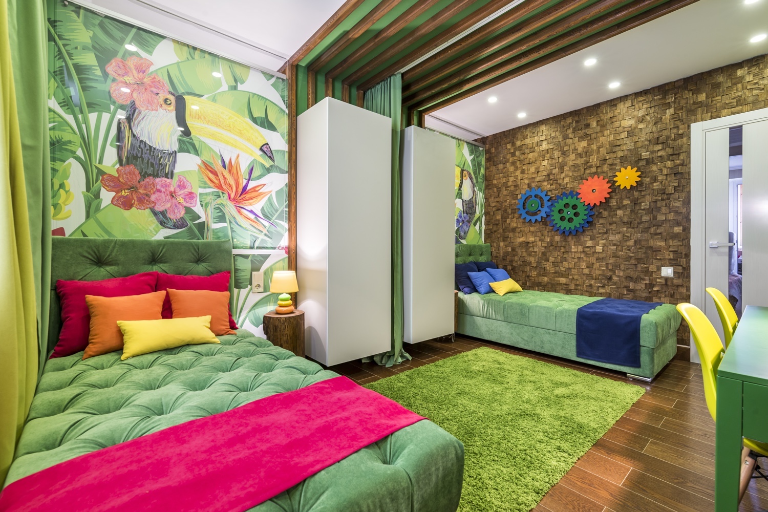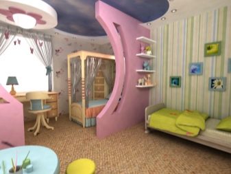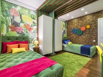 - 2 habitaciones para niños - una gran opción para parejas con dos hijos. Deberá elegir la habitación más grande e instalar una partición de cartón yeso en el medio. Si solo hay una ventana en la habitación, no se desanime: en la "pared" de placas de yeso puede hacer una falsa, a través de la cual la luz penetrará en la parte no iluminada a través de la ventana principal. Si los niños son de diferentes sexos, este método "funcionará" hasta que lleguen a la adolescencia. Es más fácil con niños del mismo sexo: ni siquiera es necesario instalar una pared: simplemente puede delimitar el espacio con un armario, un perchero o una partición de listones livianos.