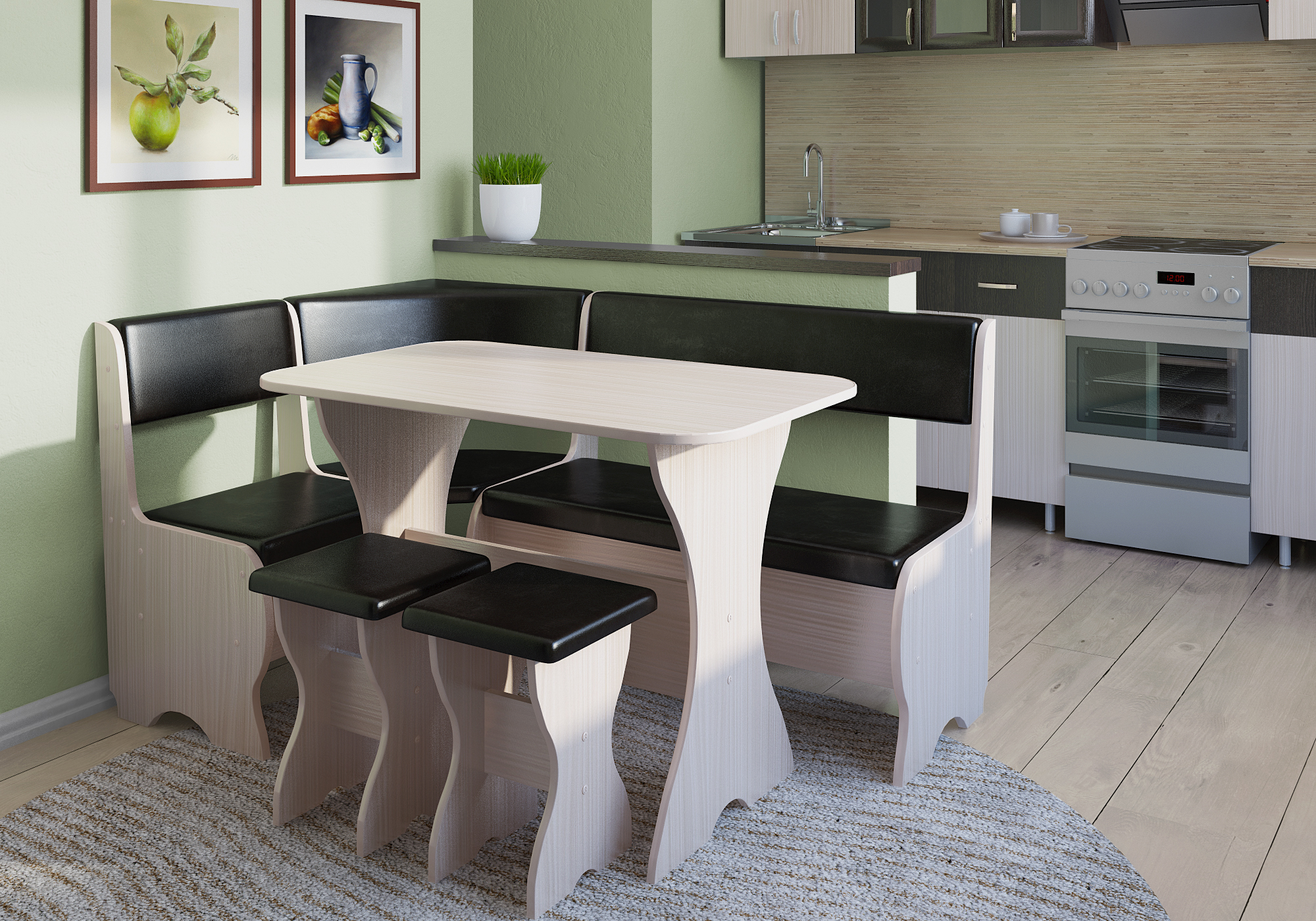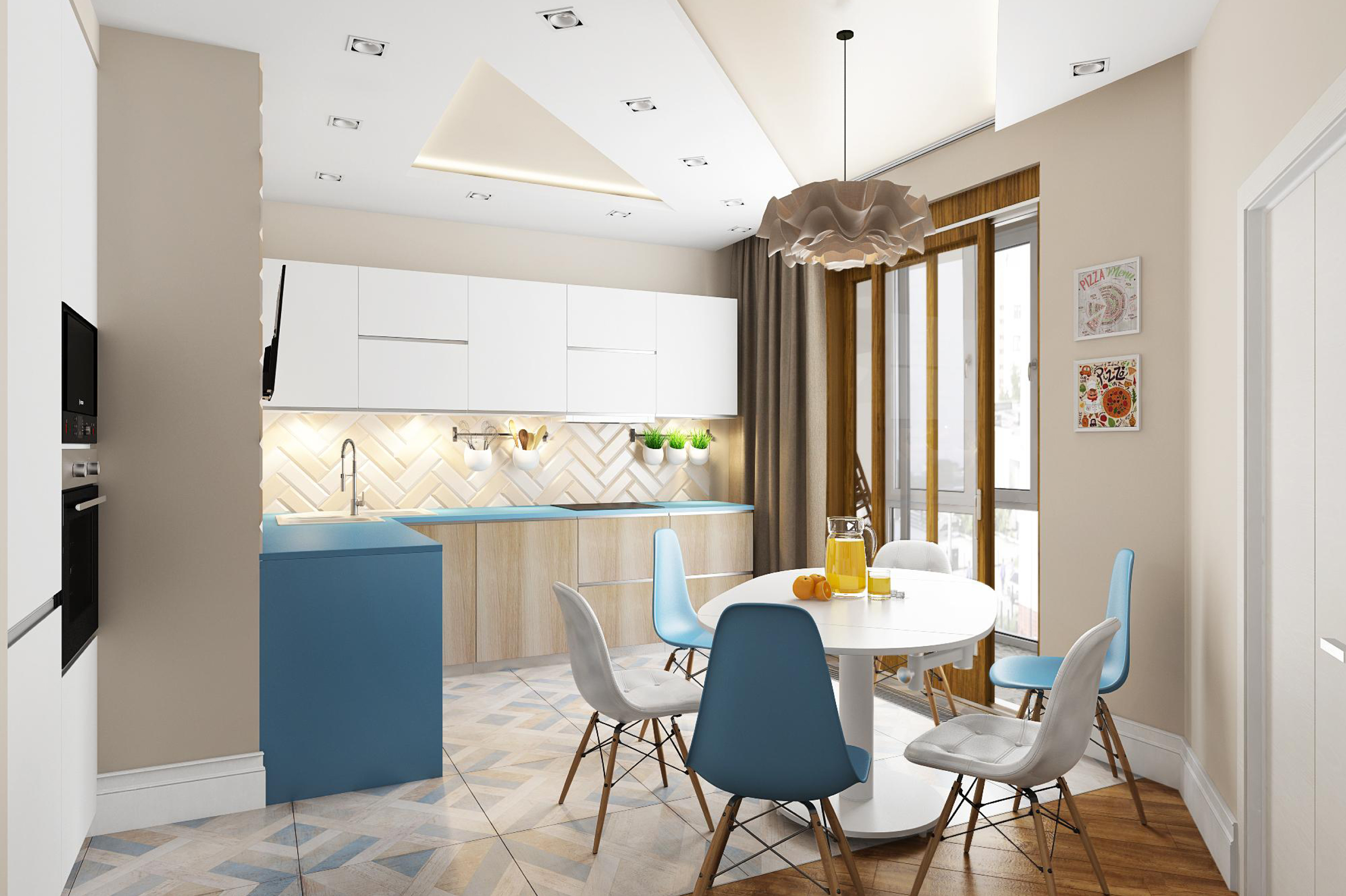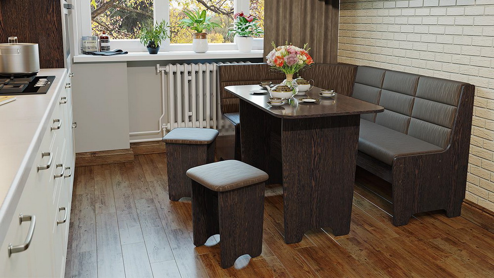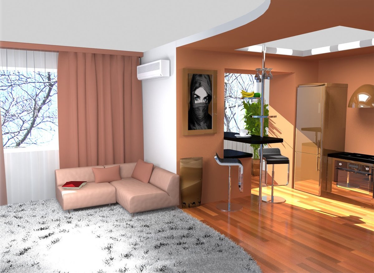 - Equipar una zona de estar en la cocina. Si el área de su cocina es lo suficientemente grande, ¿por qué no convertirla en una especie de combinación de cocina, comedor y sala de estar, y reservar las dos habitaciones restantes como dormitorios? He aquí cómo hacerlo: instale un fregadero, una estufa, un refrigerador y superficies de trabajo en una parte de la habitación, coloque un área de comedor en el centro y coloque un sofá y una mesa de café en la pared opuesta. El televisor se instala en cualquier lugar conveniente.